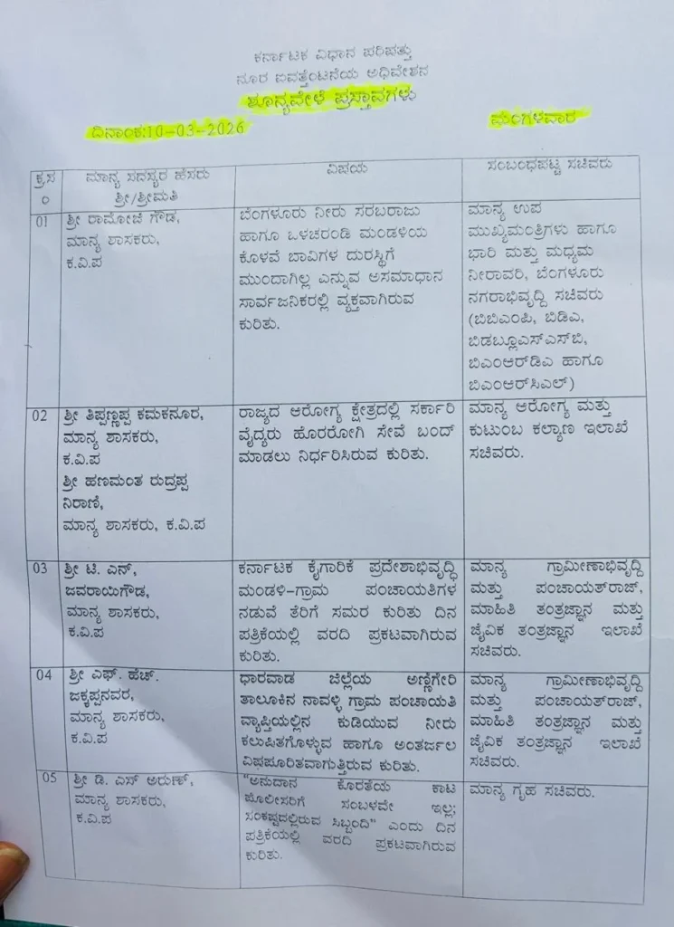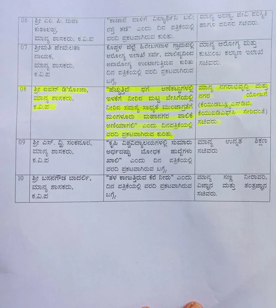 ದಿನಾಂಕ : 10-03-2026 ರಂದು ವಿಧಾನ ಪರಿಷತ್ತಿನ ಶಾಸಕರಾದ ಐವನ್ ಡಿ ಸೋಜಾ ರವರು ಸದನದ ಶೂನ್ಯ ವೇಳೆಯಲ್ಲಿ ಮಂಗಳೂರು ನಗರದಲ್ಲಿ ಹೆಚ್ಚುತ್ತಿರುವ ಧಗೆಗೆ ಆಣೆಕಟ್ಟುಗಳಲ್ಲಿ ನೀರಿನ ಮಟ್ಟ ಇಳಿಕೆಗೆ ಬೇಸಗೆಯಲ್ಲಿ ನೀರಿನ ಸಮಸ್ಯೆ ಸಾಧ್ಯತೆ ಮುಂಜಾಗ್ರತೆಗೆ ಮಂಗಳೂರು ಮಹಾನಗರ ಪಾಲಿಕೆ ಅಣಿಯಾಗಲಿದೆ ಎಂದು ಮಾನ್ಯ ಸಭಾಪತಿಯವರ ಮೂಲಕ ಮಾನ್ಯ ನಗರಾಭಿವೃದ್ಧಿ ಸಚಿವರ ಗಮನ ಸೆಳೆದರು.