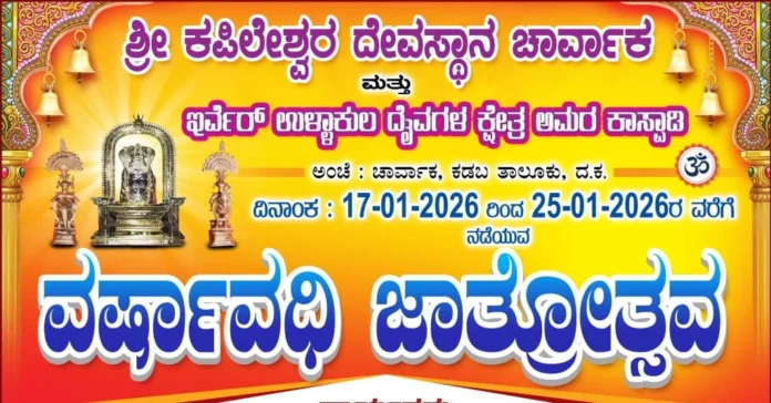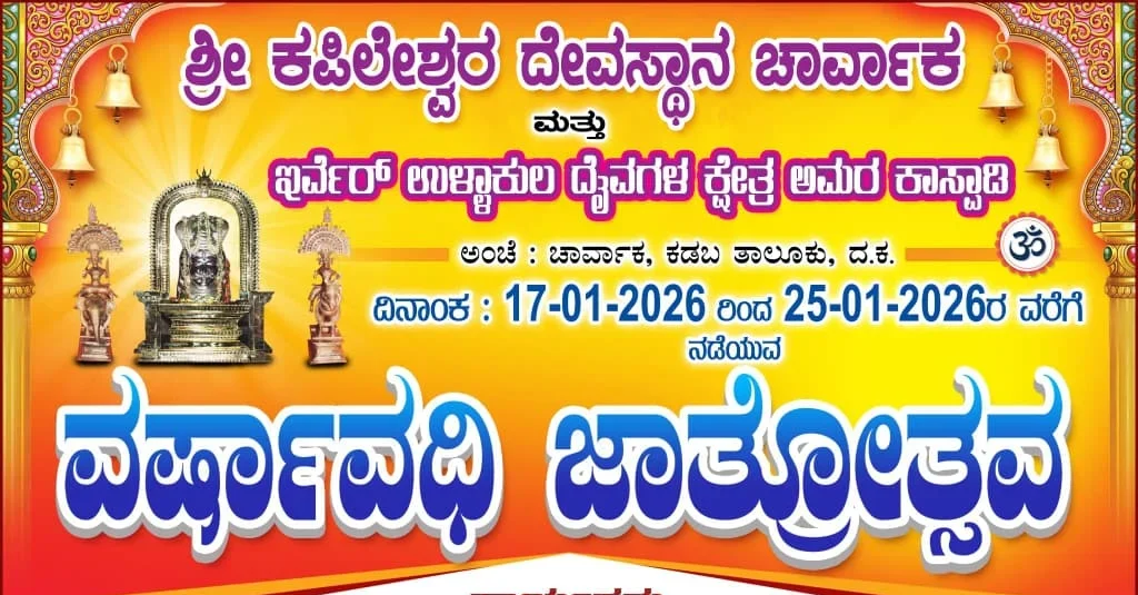 ಶ್ರೀ ಕಪಿಲೇಶ್ವರ ದೇವಸ್ಥಾನ ಚಾರ್ವಾಕ ಇರ್ವೆರ್ ಉಳ್ಳಾಕುಲ ದೈವಗಳ ಕ್ಷೇತ್ರ ಅಮರ ಕಾಲ್ಪಾಡಿ ಜ : 17-01-2026 ಜ. 25-01-2026ರವರೆಗೆ ವರ್ಷಾವಧಿ ಜಾತ್ರೋತ್ಸವ ನಡೆಯಲಿದೆ.