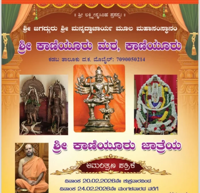 ಶ್ರೀ ಕಾಣಿಯೂರು ಮಠದಲ್ಲಿ ಫೆ. 20ರಿಂದ 24 ರವರೆಗೆ ಜಾತ್ರಾ ಮಹೋತ್ಸವ