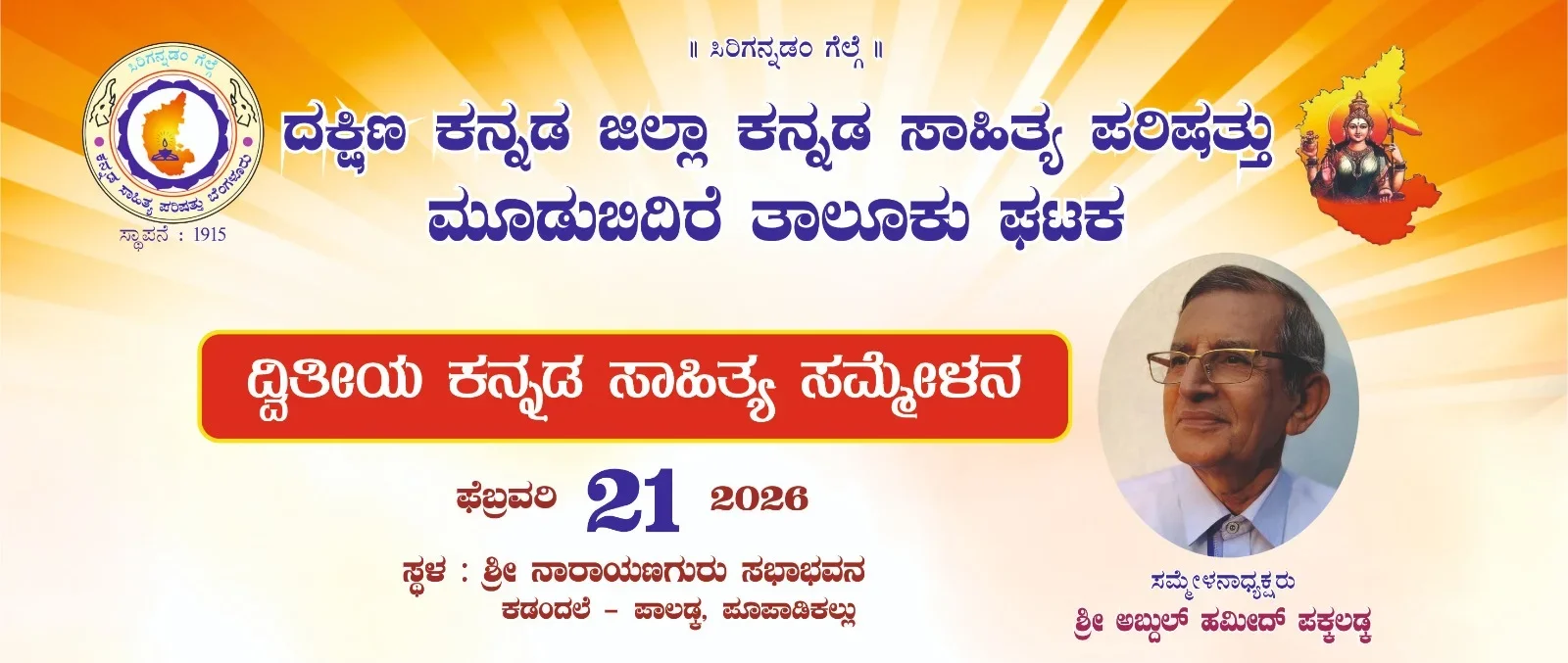 ದಕ್ಷಿಣ ಕನ್ನಡ ಜಿಲ್ಲಾ ಕನ್ನಡ ಸಾಹಿತ್ಯ ಪರಿಷತ್ತು ಮೂಡುಬಿದಿರೆ ತಾಲೂಕು ಘಟಕ, ದ್ವಿತೀಯ ಸಾಹಿತ್ಯ ಸಮ್ಮೇಳನವು ಫೆ.21 ರಂದು ಶ್ರೀ ನಾರಾಯಣಗುರು ಸಭಾಭವನ ಕಡಂದಲೆ – ಪಾಲಡ್ಕ,ಪೂಪಾಡಿಕಲ್ಲು ಎಂಬಲ್ಲಿ ನಡೆಯಲಿದೆ.