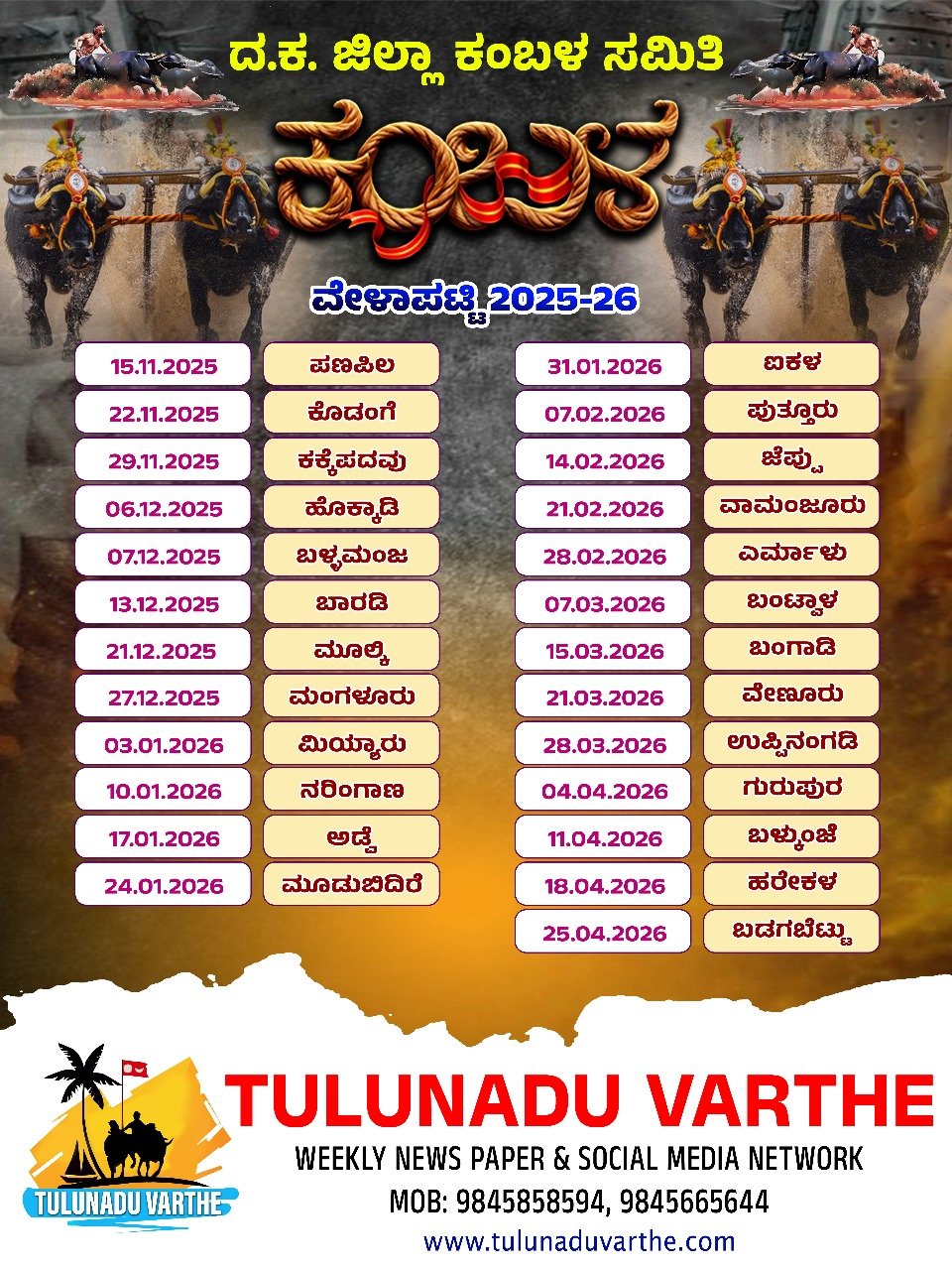 ಕರ್ನಾಟಕ ರಾಜ್ಯ ಕ್ರೀಡಾ ಪ್ರಾಧಿಕಾರ ಮತ್ತು ಯುವಜನ ಸಬಲೀಕರಣ ಇಲಾಖೆಯ ಅಧೀನಪಟ್ಟ ರಾಜ್ಯ ಕಂಬಳ ಸಮಿತಿಯು 25- 26ನೇ ಸಾಲಿನ ಕಂಬಳ ವೇಳಾಪಟ್ಟಿಯನ್ನು ಬಿಡುಗಡೆ ಮಾಡಿದೆ. ನವೆಂಬರ್ 15ರಿಂದ ಪಣಪಿಲದಲ್ಲಿ ಪ್ರಾರಂಭವಾಗುವ ಕಂಬಳವು ಏಪ್ರಿಲ್ 25 ಬಡಗಬೆಟ್ಟು ಕಂಬಳದೊಂದಿಗೆ ಮುಕ್ತಾಯಗೊಳ್ಳಲಿದೆ.