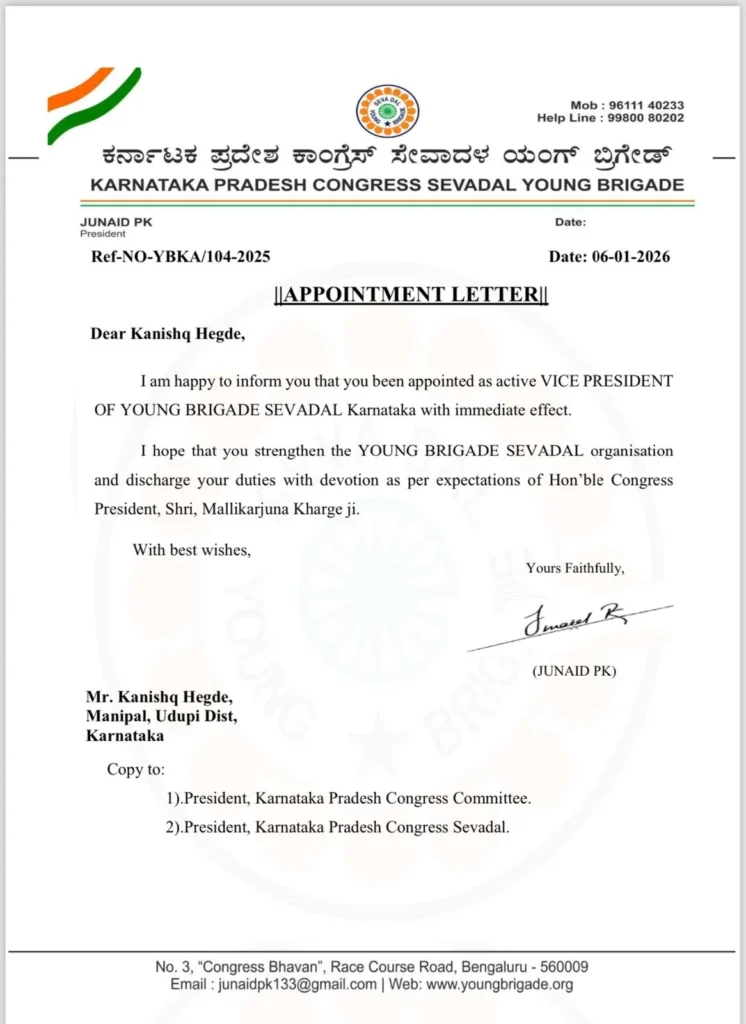 ಯಂಗ್ ಬ್ರಿಗೇಡ್ನ ರಾಜ್ಯಾಧ್ಯಕ್ಷರಾದ ಜುನೈದ್ ಪಿ.ಕೆ ಅವರು ಈ ಅಧಿಕೃತ ನೇಮಕಾತಿ ಆದೇಶವನ್ನು ಹೊರಡಿಸಿದ್ದಾರೆ. ಸಂಘಟನೆಯನ್ನು ರಾಜ್ಯಾದ್ಯಂತ ಬಲಪಡಿಸುವ ಮತ್ತು ಯುವ ಶಕ್ತಿಯನ್ನು ಒಗ್ಗೂಡಿಸಿ ಕಾಂಗ್ರೆಸ್ ಪಕ್ಷದ ತತ್ವ ಸಿದ್ಧಾಂತಗಳನ್ನು ಮನೆಮನೆಗೆ ತಲುಪಿಸುವ ಜವಾಬ್ದಾರಿಯನ್ನು ಕನಿಷ್ಕ್ ಹೆಗ್ಡೆ ಅವರಿಗೆ ವಹಿಸಲಾಗಿದೆ.