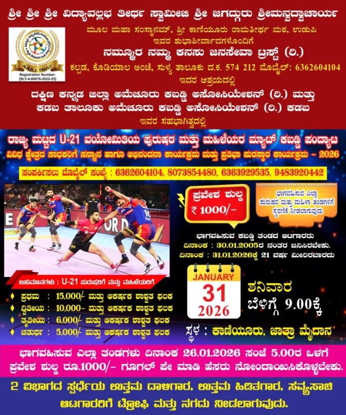 ಕಾಣಿಯೂರು ಜಾತ್ರಾ ಮೈದಾನ : ಶ್ರೀ ಶ್ರೀ ಶ್ರೀ ವಿದ್ಯಾವಲ್ಲಭ ತೀರ್ಥ ಸ್ವಾಮೀಜಿ ಶ್ರೀ ಜಗದ್ಗುರು ಶ್ರೀಮನ್ವದ್ವಾಚಾರ್ಯ ,ಮೂಲ ಮಹಾ ಸಂಸ್ಥಾನಮ್, ಶ್ರೀ ಕಾಣಿಯೂರು ರಾಮತೀರ್ಥ ಮಠ, ಉಡುಪಿ ಇವರ ಶುಭಾಶೀರ್ವಾದಗಳೊಂದಿಗೆ ನಮ್ಮೂರ ನಮ್ಮ ಕನಸು ಜನಸೇವಾ ಟ್ರಸ್ಟ್ (ರಿ.)ಕಲ್ಪಡ, ಕೊಡಿಯಾಲ ಅಂಚೆ, ಸುಳ್ಯ ತಾಲೂಕು ದ.ಕ. ಇದರ ಆಶ್ರಯದಲ್ಲಿ , ದಕ್ಷಿಣ ಕನ್ನಡ ಜಿಲ್ಲಾ ಅಮೆಚೂರು ಕಬಡ್ಡಿ ಅಸೋಸಿಯೇಶನ್ (ರಿ.) ಮತ್ತು ಕಡಬ ತಾಲೂಕು ಅಮೆಚೂರು ಕಬಡ್ಡಿ ಅಸೋಸಿಯೇಶನ್ (ರಿ.) ಕಡಬ ಇವರ ಸಹಭಾಗಿತ್ವದಲ್ಲಿ ಜ.31 ಶನಿವಾರ ಬೆಳ್ಳಿಗ್ಗೆ 9-00 ಕ್ಕೆ ರಾಜ್ಯ ಮಟ್ಟದ U-21 ವಯೋಮಿತಿಯ ಪುರುಷರ ಮತ್ತು ಮಹಿಳೆಯರ ಮ್ಯಾಟ್ ಕಬಡ್ಡಿ ಪಂದ್ಯಾಟ ಆಯೋಜಿಸಲಾಗಿದೆ.