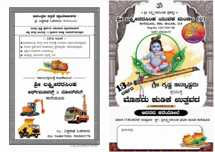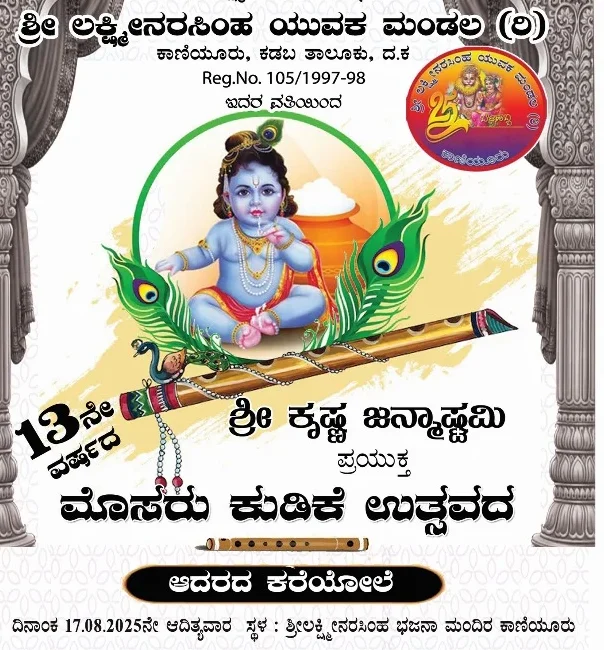 Uncategorizedಕಾಣಿಯೂರು: ಆ. 17ರಂದು ಮೊಸರು ಕುಡಿಕೆ ಉತ್ಸವBy TNVOffice - August 19, 2025035FacebookTwitterPinterestWhatsApp ಕಡಬ: ಶ್ರೀ ಲಕ್ಷ್ಮೀ ನರಸಿಂಹ ಯುವಕ ಮಂಡಲ (ರಿ.) ಕಾಣಿಯೂರು ಕಡಬ ಇದರ ವತಿಯಿಂದ 13ನೇ ವರ್ಷದ ಶ್ರೀ ಕೃಷ್ಣ ಜನ್ಮಾಷ್ಠಮಿ ಪ್ರಯುಕ್ತ ಮೊಸರು ಕುಡಿಕೆ ಉತ್ಸವ . ಆ. 17ರಂದು ಕಾಣೀಯೂರು ಭಜನ ಮಂದಿರದಲ್ಲಿ ಜರಗಲಿದೆ.