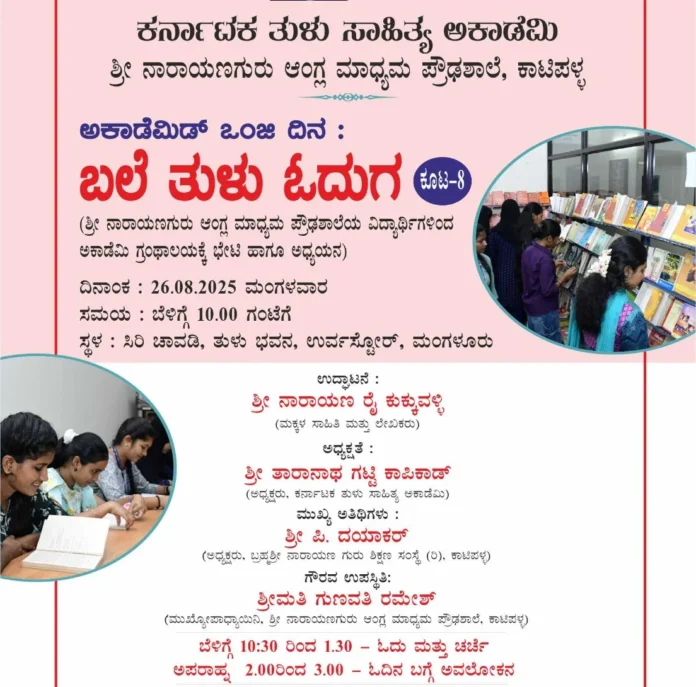ಮಂಗಳೂರು : ಕರ್ನಾಟಕ ತುಳು ಸಾಹಿತ್ಯ ಅಕಾಡೆಮಿಯು ಯುವಜನರಲ್ಲಿ ತುಳು ಸಾಹಿತ್ಯ ಓದಿನ ಅಭಿರುಚಿ ಮೂಡಿಸಲು ಹಮ್ಮಿಕೊಂಡಿರುವ ‘ಅಕಾಡೆಮಿಡ್ ಒಂಜಿ ದಿನ ; ಬಲೆ ತುಳು ಓದುಗ’ ಅಭಿಯಾನದ ಎಂಟನೇ ಕಾರ‍್ಯಕ್ರಮ ನಾಳೆ ಆ.26 ರಂದು ನಡೆಯಲಿದೆ.