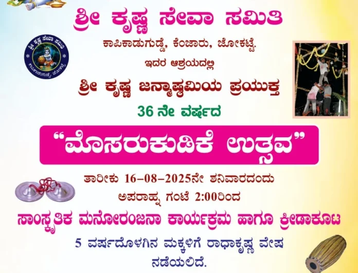 ಬಜಪೆ: ಶ್ರೀ ಕೃಷ್ಣ ಸೇವಾ ಸಮಿತಿ ಕಾಪಿಕಾಡುಗುಡ್ಡೆ , ಕೆಂಜಾರು, ಜೋಗಟ್ಟೆ ಇದರ ಆಶ್ರಯದಲ್ಲಿ ಶ್ರೀ ಕೃಷ್ಣ ಜನ್ಮಾಷ್ಠಮಿ ಪ್ರಯುಕ್ತ ೩೬ನೇ ವರ್ಷದ ಮೊಸರು ಕುಡಿಕೆ ಉತ್ಸವ ಆ. ೧೬ರಂದು ನಡೆಯಲಿದೆ.