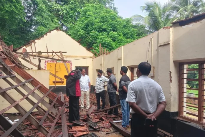 ದಕ್ಷಿಣ ಕನ್ನಡ: ಕೆಂಜಾರು ಬಳಿಯ ಮುಖ್ಯಪ್ರಾಣ ಪೂರ್ವ ಪ್ರಾಥಮಿಕ ಶಾಲೆಯ ಮೇಲ್ಛಾವಣಿ ವಿಪರೀತ ಮಳೆಯ ಕಾರಣ ಕುಸಿದು ಬಿದ್ದಿತ್ತು. ವಿಷಯ ತಿಳಿದ ತಕ್ಷಣ ಶಾಸಕ ಉಮಾನಾಥ ಕೋಟ್ಯಾನ್ ಅವರು ಸ್ಥಳಕ್ಕೆ ಭೇಟಿ ನೀಡಿ ಸಂಬಂಧ ಪಟ್ಟ ಅಧಿಕಾರಿಗಳನ್ನು ಕರೆದು ಶೀಘ್ರ ದುರಸ್ತಿ ಮಾಡಲು ನಿರ್ದೇಶಿಸಿದರು. ಮಕ್ಕಳಾರೂ ಇಲ್ಲದಾಗ ಬಿದ್ದ ಕಾರಣ ಯಾವುದೇ ಪ್ರಾಣಾಪಾಯ ಸಂಭವಿಸಲಿಲ್ಲ ಎಂದು ತಿಳಿದು ಬಂದಿದೆ.