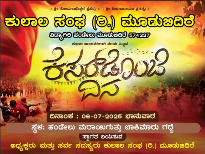 Uncategorizedಮೂಡುಬಿದಿರೆ ಕುಲಾಲ ಸಂಘದ ವತಿಯಿಂದ ಜು. 6ರಂದು ಕೆಸರ್ಡೊಂಜಿ ದಿನBy TNVOffice - July 4, 20250309FacebookTwitterPinterestWhatsApp ಡುಬಿದಿರೆ: ಕುಲಾಲ ಸಂಘ (ರಿ.) ಮೂಡುಬಿದಿರೆ ವತಿಯಿಂದ ಕುಲಾಲ ಬಾಂಧವರಿಗಾಗಿ ವಲಯ ಮಟ್ಟದ ಕೆಸರ್ಡೊಂಜಿ ದಿನ ಕ್ರೀಡಾಕೂಟವು ಜು. 6ರಂದು ಮೂಡುಬಿದಿರೆಯ ಹಂಡೇಲು ಮರಾಯಿಗುತ್ತು ಬಾಕಿಮಾರು ಗದ್ದೆಯಲ್ಲಿ ನಡೆಯಲಿದೆ ಎಂದು ಆಯೋಜಕರು ತಿಳಿಸಿದ್ದಾರೆ.