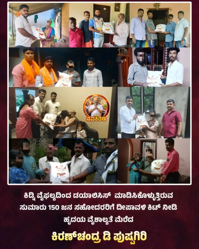 ಧಾರ್ಮಿಕ ಮುಖಂಡರು, ಸಮಾಜ ಸೇವಕರು ಕಿರಣ್ ಚಂದ್ರ ಡಿ ಪುಷ್ಪಗಿರಿಯವರು ಬೆಳ್ತಂಗಡಿ ತಾಲೂಕಿನಲ್ಲಿ ಕಿಡ್ನಿ ವೈಫಲ್ಯದಿಂದ ಬಳಲುತ್ತಾ ಡಯಾಲಿಸ್ ಮಾಡಿಸುತ್ತಿರುವ 150 ಜನ ಬಂಧುಗಳಿಗೆ ದೀಪಾವಳಿ ಹಬ್ಬದ ಶುಭ ಸಂದರ್ಭದಲ್ಲಿ ಅಕ್ಕಿ ಹಾಗೂ ದಿನಸಿ ಆಹಾರ ಸಾಮಗ್ರಿಗಳನ್ನು ಒಳಗೊಂಡ ದೀಪಾವಳಿ ಕಿಟ್ ನೀಡಿ ಅವರೊಂದಿಗೆ ದೀಪಾವಳಿ ಹಬ್ಬವನ್ನು ಆಚರಣೆ ಮಾಡಿದರು.