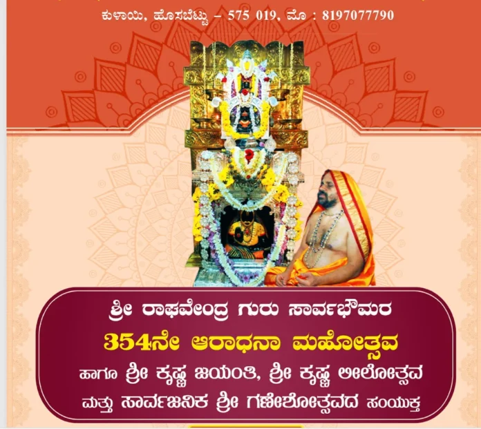 ಸುರತ್ಕಲ್: ‌ಶ್ರೀ ಪುತ್ತಿಗೆ ಮಠ, ನವ ವ್ರಂದಾವನ ಸೇವಾ ಪ್ರತಿಷ್ಠಾನ, ಶ್ರೀ ಗುರು ರಾಘವೇಂದ್ರ ಮಠ ಇಲ್ಲಿ ಶ್ರೀ ರಾಘವೇಂದ್ರ ಗುರು ಸಾರ್ವಭೌಮರ 354ನೇ ಆರಾಧನಾ ಮಹೋತ್ಸವ ಹಾಗೂ ಶ್ರೀ ಕೃಷ್ಣ ಜಯಂತಿ, ಶ್ರೀ ಕೃಷ್ಣ ಲೀಲೋತ್ಸವ ಮತ್ತು ಶ್ರೀ ಸಾರ್ವಜನಿಕ ಗಣೇಶೋತ್ಸವ ಕಾರ್ಯಕ್ರಮ ಆ. 10ರಿಂದ 12ರವರೆಗೆ ಜರಗಲಿದೆ.