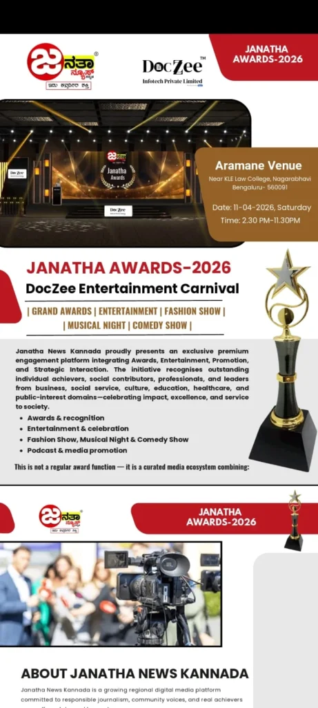 ಪೆರ್ನಾಜೆ : ಜನತಾ ನ್ಯೂಸ್ ಕನ್ನಡ ವತಿಯಿಂದ ಆಯೋಜಿಸಲಾಗಿರುವ ವಿವಿಧ ಕ್ಷೇತ್ರಗಳಲ್ಲಿ ಸಾಧನೆ ಮಾಡಿರುವ ಸಾಧಕರನ್ನು ಗುರುತಿಸಿ ಗೌರವಿಸಿ ಸನ್ಮಾನಿಸಲು ಜನತಾ ಅವಾರ್ಡ್ಸ್ 2026 ಕಾರ್ಯಕ್ರಮವನ್ನು ಬೆಂಗಳೂರಿನ ನಾಗರಭಾವಿ KLE ಲಾ ಕಾಲೇಜಿನ ಸಮೀಪ ಅರಮನೆ ವೆನ್ಯೂವಿ ನಲ್ಲಿ ವೈವಿಧ್ಯಮಯ ಕಾರ್ಯಕ್ರಮ ಗಳೊಂದಿಗೆ ಏರ್ಪಡಿಸಲಾಗಿದ್ದು.
