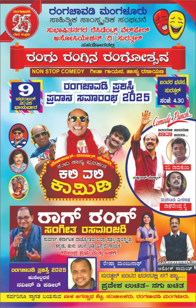 ಸುರತ್ಕಲ್ : ರಂಗ ಚಾವಡಿ ಮಂಗಳೂರು ಸಾಹಿತ್ಯಿಕ ಸಾಂಸ್ಜೃತಿಕ ಸಂಘಟನೆ ಮತ್ತು ಸುಭಾಷಿತ ನಗರ ರೆಸಿಡೆಂಟ್ಸ್ ವೆಲ್ ಫೇರ್ ಅಸೋಸಿಯೇಶನ್ (ರಿ) ಸುರತ್ಕಲ್ ಇದರ ಆಶ್ರಯದಲ್ಲಿ ರಂಗು ರಂಗಿನ ರಂಗೋತ್ಸವ, ರಂಗಚಾವಡಿ ಬೆಳ್ಳಿಹಬ್ಬದ ಸಂಭ್ರಮ ನವಂಬರ್ 9 ಭಾನುವಾರ ಸಂಜೆ 4.30 ಕ್ಕೆ ಸುರತ್ಕಲ್ ಬಂಟರ ಭವನದಲ್ಲಿ ನಡೆಯಲಿದೆ.