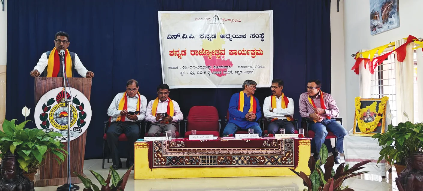 ವೇದಿಕೆಯಲ್ಲಿ ಮಂಗಳೂರು ವಿ.ವಿಯ ಹಣಕಾಸು ಸಚಿವ ಪಂಚಲಿಂಗ ಸ್ವಾಮಿ, ಪರೀಕ್ಷಾಂಗ ಕುಲಸಚಿವ ದೇವೇಂದ್ರಪ್ಪ, ಎಸ್.ವಿ.ಪಿ ಕನ್ನಡ ಅಧ್ಯಯನ ಸಂಸ್ಥೆಯ ಅಧ್ಯಕ್ಷರ ಪ್ರೊ. ನಾಗಪ್ಪ ಗೌಡ ಉಪಸ್ಥಿತರಿದ್ದರು. ಪ್ರೊ.ಸೋಮಣ್ಣ ಹೊಂಗಳ್ಳಿ ಸ್ವಾಗತಿಸಿ, ಡಾ. ಧನಂಜಯ ಕುಂಬ್ಳೆ ವಂದಿಸಿದರು. ಡಾ. ಯಶುಕುಮಾರ್ ಡಿ ನಿರೂಪಿಸಿದರು.