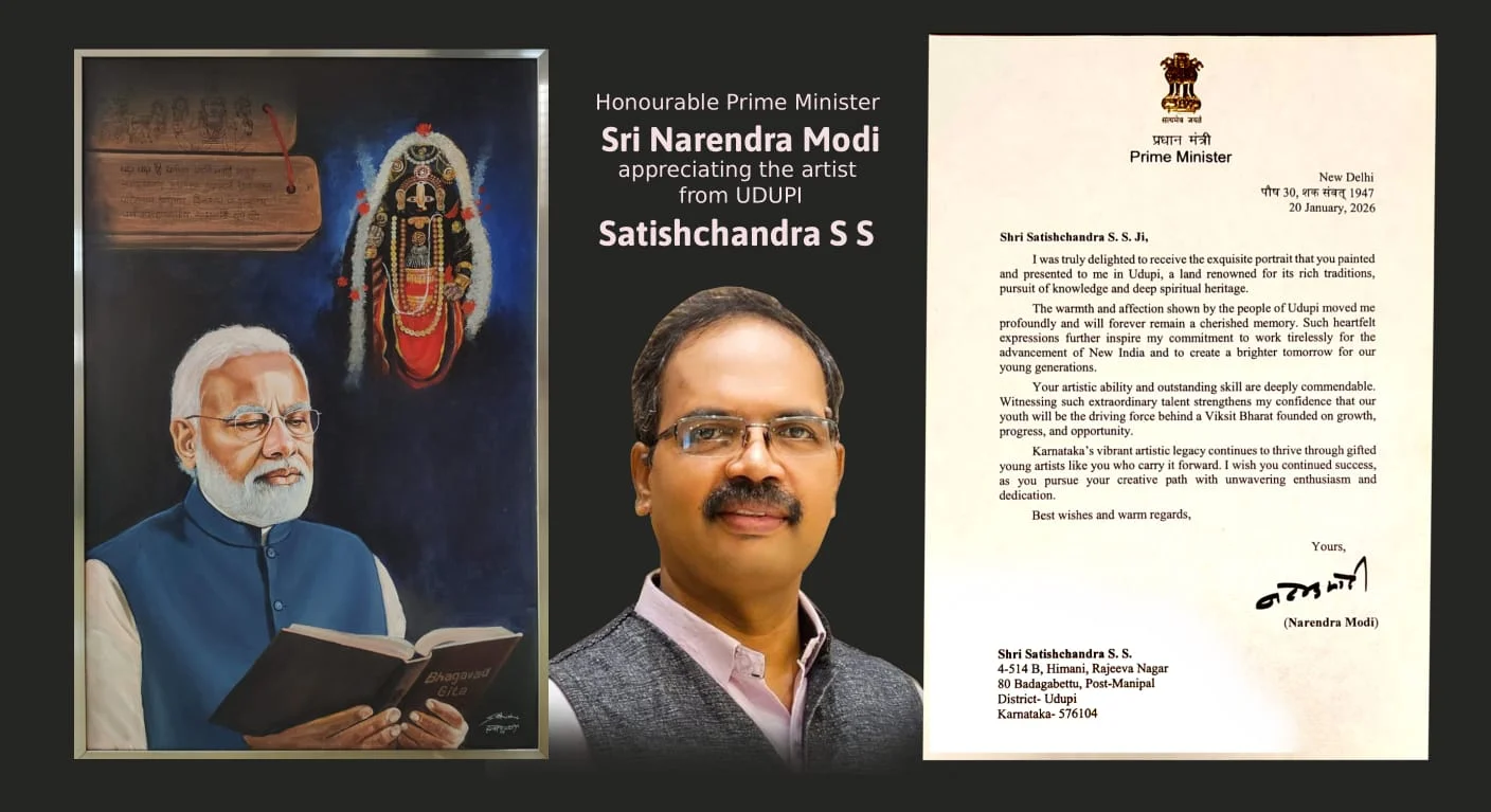ಉಡುಪಿ : ಮಣಿಪಾಲ್ ಗ್ರೂಪ್‌ನ ಎಂಜಿಪಿಎಸ್‌ನಲ್ಲಿ  ಕಾರ್ಯ ನಿರ್ವಸುತ್ತಿರುವ   ಕಲಾವಿದ ಸತೀಶ್ಚಂದ್ರ ಅವರು  ಉಡುಪಿಯಲ್ಲಿ ನಡೆದ ಲಕ್ಷ ಕಂಠ ಗೀತೆ ಕಾರ್ಯಕ್ರಮದ ಸಂದರ್ಭದಲ್ಲಿ ಮೋದಿಗೆ ಉಡುಗೊರೆಯಾಗಿ ನೀಡಿದ ಸುಂದರವಾದ ಚಿತ್ರಕಲೆಗಾಗಿ ಗೌರವಾನ್ವಿತ ಪ್ರಧಾನಿ ನರೇಂದ್ರ ಮೋದಿಯವರಿಂದ ಮೆಚ್ಚುಗೆ ಪತ್ರವನ್ನು ರವಾನಿಸಿ ಹಾರೈಸಿದ್ದಾರೆ .