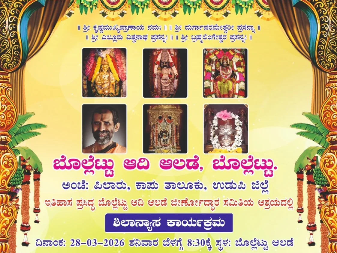 ಕಾಪು : ಇತಿಹಾಸ ಪ್ರಸಿದ್ದ ಬೊಲ್ಲೆಟ್ಟು ಆದಿ ಅಲಡೆ ಜೀರ್ಣೋದ್ಧಾರ ಸಮಿತಿಯ ಅಶ್ರಯದಲ್ಲಿ ಶಿಲಾನ್ಯಾಸ ಕಾರ್ಯಕ್ರಮ ಮಾರ್ಚ್ 28 ರ ಬೆಳಿಗ್ಗೆ 8.30 ಕ್ಕೆ ಬೊಲ್ಯೊಟ್ಟು ಆಲಡೆಯಲ್ಲಿ ನಡೆಯಲಿದೆ.