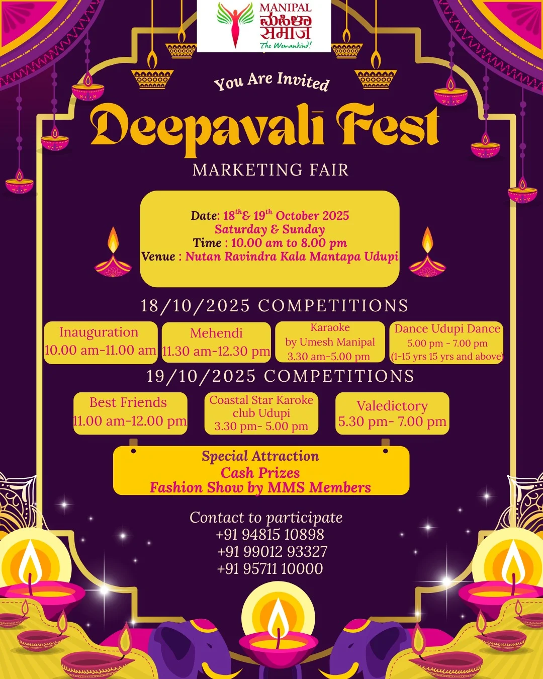 ಮಹಿಳಾ ಸಮಾಜ, ಮಣಿಪಾಲ ಇದರ ವತಿಯಿಂದ ಸಾರ್ವಜನಿಕರಿಗೆ ದೀಪಾವಳಿ ಉತ್ಸವವನ್ನು ಉಡುಪಿ ಎಂ.ಜಿ.ಎಂ ಕಾಲೇಜಿನ ನೂತನ ಕಲಾ ಮಂಟಪ ಮತ್ತು ರವೀಂದ್ರ ಕಲಾ ಮಂಟಪದಲ್ಲಿ ಅಕ್ಟೋಬರ್ 18 ಮತ್ತು 19ರಂದು ಆಯೋಜಿಸಿದೆ.