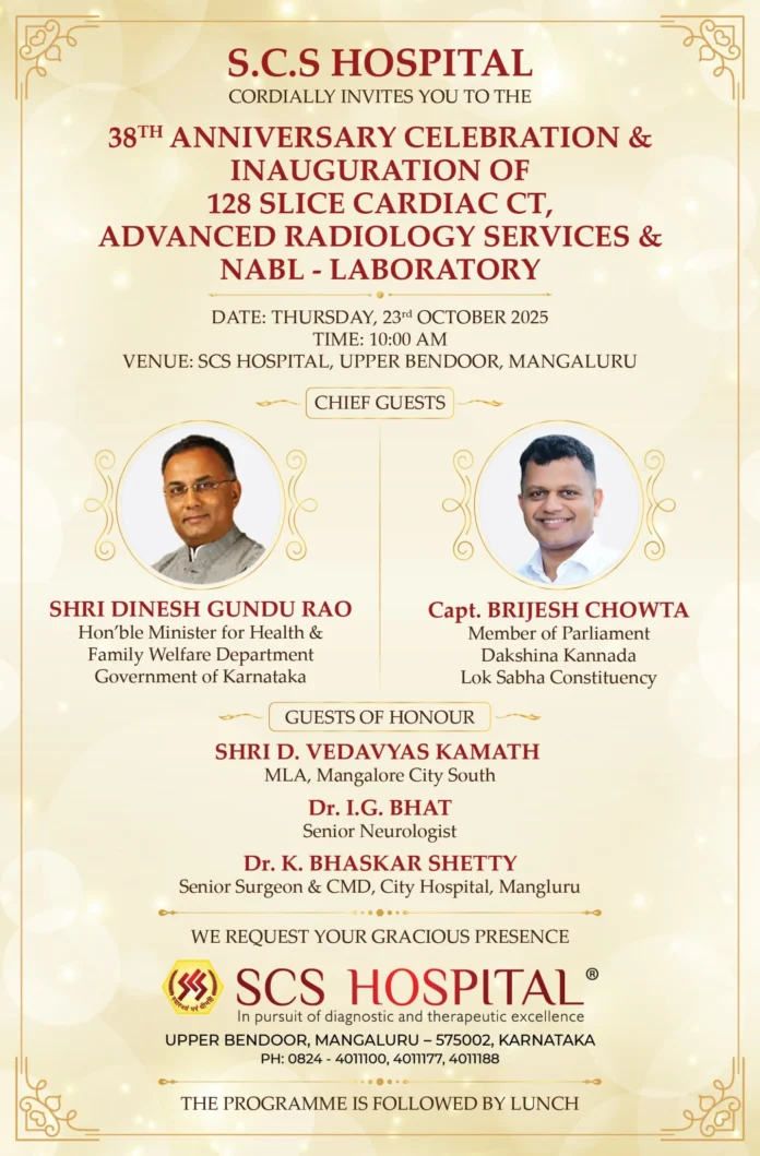 ಮಂಗಳೂರು, ಕರ್ನಾಟಕ – ಅಕ್ಟೋಬರ್ 20, 2025 – ಕರಾವಳಿ ಕರ್ನಾಟಕದ ಆರೋಗ್ಯ ಸೇವೆಯಲ್ಲಿ ಅತ್ಯಂತ ವಿಶ್ವಾಸಾರ್ಹ ಹೆಸರುಗಳಲ್ಲಿ ಒಂದಾದ ಎಸ್‌ಸಿಎಸ್ ಆಸ್ಪತ್ರೆ, ಸಮುದಾಯಕ್ಕೆ 38 ವರ್ಷಗಳ ಸಮರ್ಪಿತ ಸೇವೆಯ ಆಚರಣೆಯನ್ನು ಹೆಮ್ಮೆಯಿಂದ ಘೋಷಿಸುತ್ತದೆ. ಆಸ್ಪತ್ರೆಯು ಈ ಮೈಲಿಗಲ್ಲನ್ನು ಅಕ್ಟೋಬರ್ 23, 2025 ರಂದು ಮಂಗಳೂರು ಸಿಟಿ ಸೌತ್‌ನಲ್ಲಿರುವ ತನ್ನ ಕ್ಯಾಂಪಸ್‌ನಲ್ಲಿ ಭವ್ಯವಾದ ಸಂಸ್ಥಾಪಕರ ದಿನ ಮತ್ತು 38 ನೇ ವಾರ್ಷಿಕೋತ್ಸವ ಆಚರಣೆಯೊಂದಿಗೆ ಗುರುತಿಸಲಿದೆ.