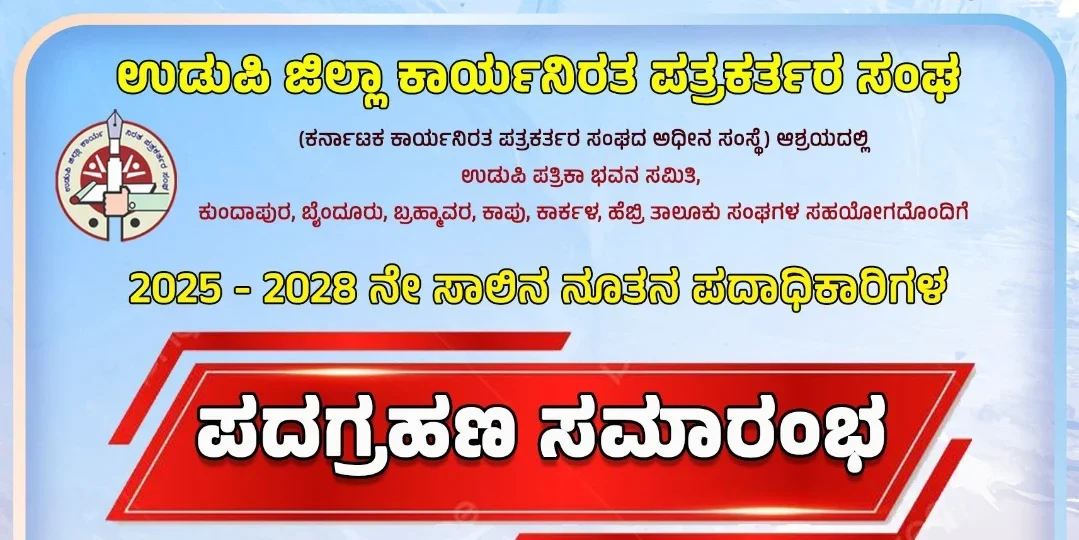 ಉಡುಪಿ ಜಿಲ್ಲಾ ಕಾರ್ಯನಿರತ ಪತ್ರಕರ್ತರ ಸಂಘ ಹಾಗೂ ಉಡುಪಿ ಪತ್ರಿಕಾ ಭವನ, ಕಾರ್ಕಳ, ಕುಂದಾಪುರ, ಬೈಂದೂರು, ಕಾಪು, ಬ್ರಹ್ಮಾವರ, ಹೆಬ್ರಿ ತಾಲೂಕು ಘಟಕಗಳ 2025-28ನೇ ಸಾಲಿನ ನೂತನ ಪದಾಧಿಕಾರಿ ಗಳ ಪದಗ್ರಹಣ ಸಮಾರಂಭವನ್ನು ಮಾ.7ರಂದು ಶನಿವಾರ ಬೆಳಗ್ಗೆ 10 ಗಂಟೆಗೆ ಉಡುಪಿ ಬ್ರಹ್ಮಗಿರಿಯ ಐಎಂಎ ಭವನದಲ್ಲಿ ಆಯೋಜಿಸಲಾಗಿದೆ.