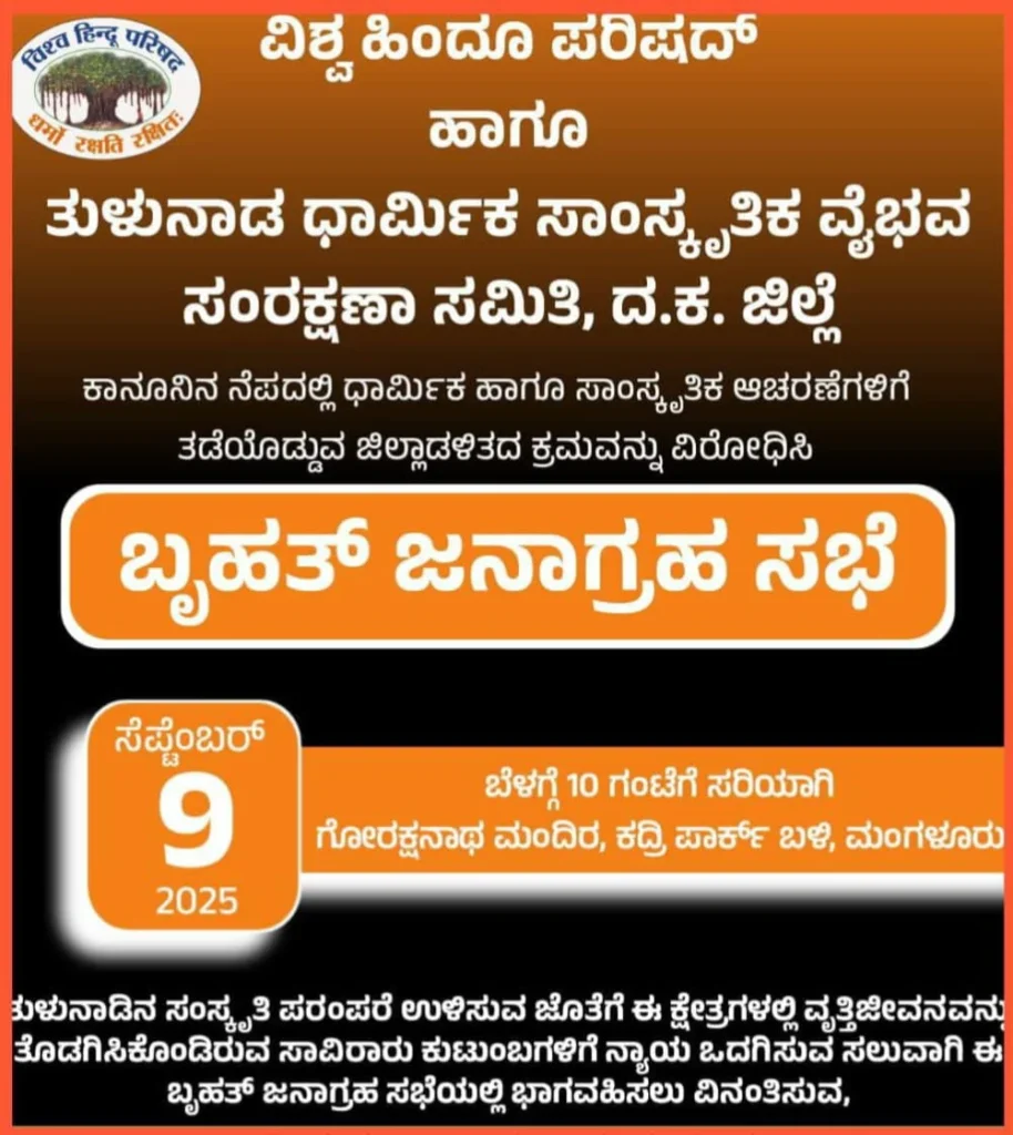ದಕ್ಷಿಣ ಕನ್ನಡ:ವಿಶ್ವಹಿಂದೂ ಪರಿಷದ್ ಹಾಗೂ ತುಳುನಾಡ ಧಾರ್ಮಿಕ ಸಾಂಸ್ಕೃತಿಕ ವೈಭವ ಸಂರಕ್ಷಣಾ ಸಮಿತಿ, ದ.ಕ. ಜಿಲ್ಲೆ ಹಾಗೂ ಇತರ ಸಂಘಟನೆಗಳ ಒಕ್ಕೂಟದೊಂದಿಗೆ ಜಾಗೃತಿ ಸಭೆ ಸೆಪ್ಟೆಂಬರ್ 9ರಂದು ನಡೆಯಲಿದೆ ಎಂದು ಪ್ರಕಟಣೆಯಲ್ಲಿ ತಿಳಿಸಿದ್ದಾರೆ.