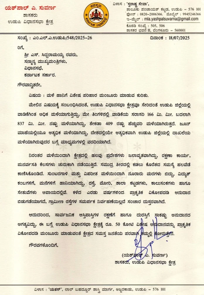 ಉಡುಪಿ ವಿಧಾನಸಭಾ ಕ್ಷೇತ್ರವೂ ಸೇರಿದಂತೆ ಉಡುಪಿ ಜಿಲ್ಲೆಯಲ್ಲಿ ವಾಡಿಕೆಗಿಂತ ಅಧಿಕ ಮಳೆಯಾಗುತ್ತಿದ್ದು, ಉಡುಪಿ ವಿಧಾನಸಭಾ ಕ್ಷೇತ್ರದ ಮಳೆ ಹಾನಿ ಸಂಬಂಧಿತ ಕಾಮಗಾರಿಗಳಿಗೆ ₹ 50 ಕೋಟಿ ವಿಶೇಷ ಅನುದಾನವನ್ನು ಮಂಜೂರು ಮಾಡುವಂತೆ ಉಡುಪಿ ಶಾಸಕ ಯಶ್ ಪಾಲ್ ಸುವರ್ಣ ಮುಖ್ಯಮಂತ್ರಿಗಳಿಗೆ ಪತ್ರ ಬರೆದು ಮನವಿ ಮಾಡಿದ್ದಾರೆ.