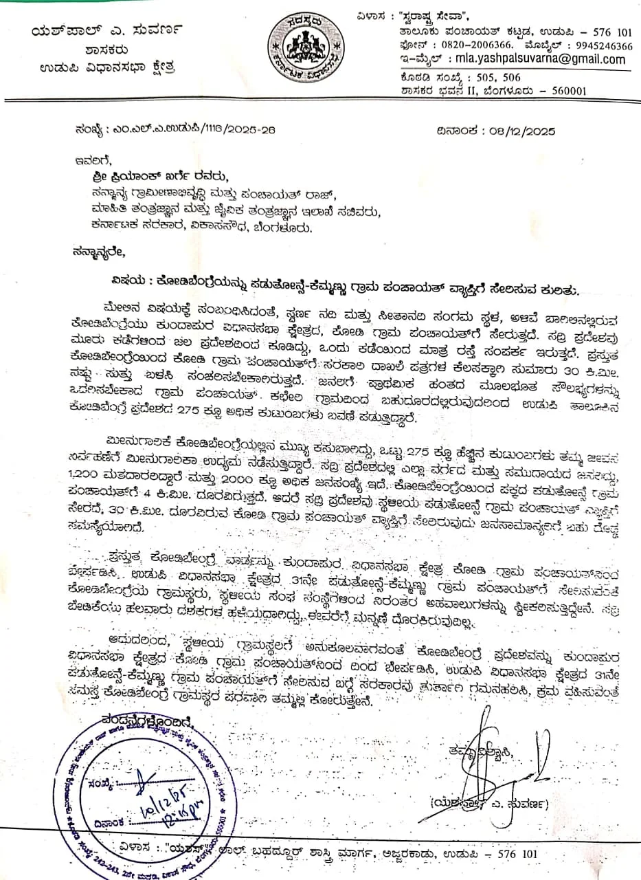 ಕುಂದಾಪುರ ವಿಧಾನಸಭಾ ಕ್ಷೇತ್ರದ ಕೋಡಿ ಗ್ರಾಮ ಪಂಚಾಯತ್ ವ್ಯಾಪ್ತಿಯಲ್ಲಿರುವ ಕೋಡಿ ಬೆಂಗ್ರೆ ಭಾಗವನ್ನು ಸ್ಥಳೀಯ ಜನತೆಯ ಬೇಡಿಕೆಯಂತೆ ಉಡುಪಿ ವಿಧಾನಸಭಾ ಕ್ಷೇತ್ರದ ಕೆಮ್ಮಣ್ಣು ಗ್ರಾಮ ಪಂಚಾಯತ್ ಗೆ ಸೇರಿಸುವಂತೆ ಉಡುಪಿ ಶಾಸಕ ಯಶ್ ಪಾಲ್ ಸುವರ್ಣ ರವರು ಗ್ರಾಮೀಣಾಭಿವೃದ್ಧಿ ಮತ್ತು ಪಂಚಾಯತ್ ರಾಜ್ ಸಚಿವರಾದ ಪ್ರಿಯಾಂಕ್ ಖರ್ಗೆ ಯವರಿಗೆ ಪತ್ರ ಬರೆದು ಮನವಿ ಮಾಡಿದ್ದಾರೆ.