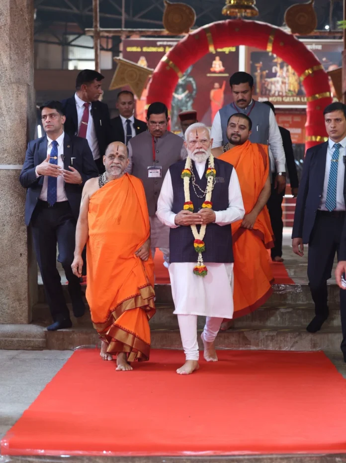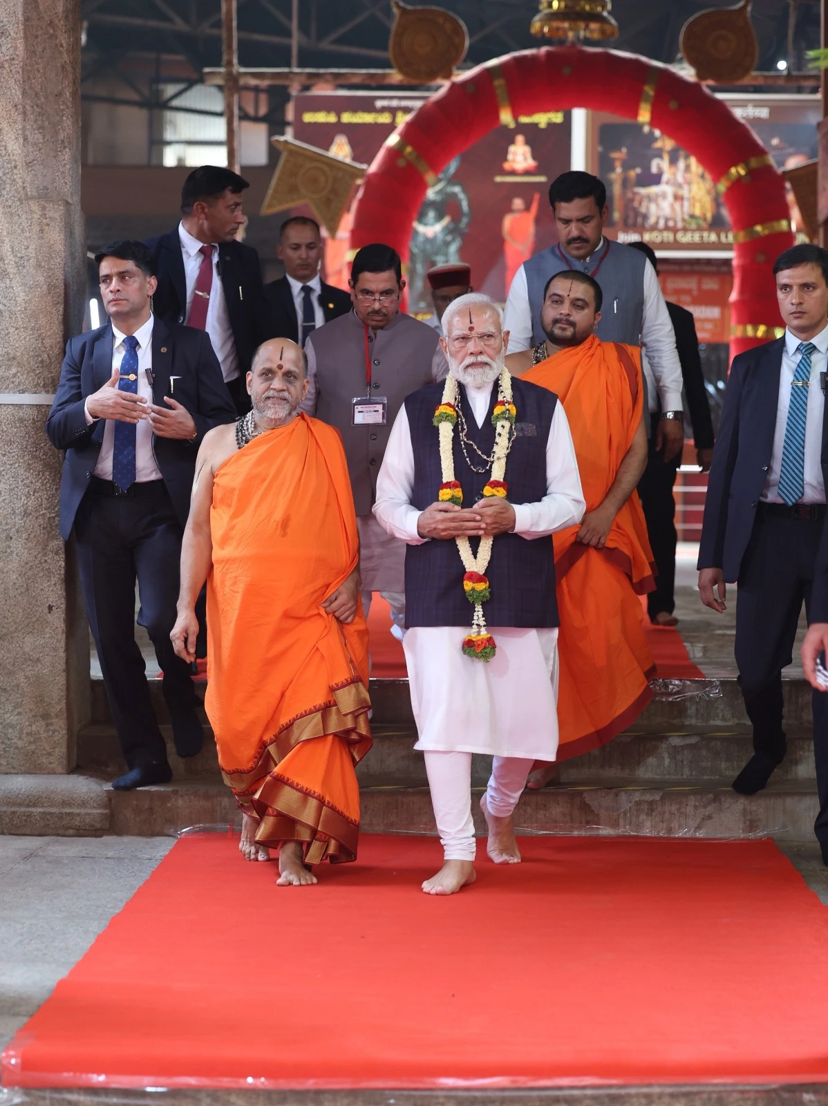 ಪರ್ಯಾಯ ಪುತ್ತಿಗೆ ಮಠದ ಶ್ರೀ ಸುಗುಣೇಂದ್ರ ತೀರ್ಥ ಸ್ವಾಮೀಜಿ ಅಶೀರ್ವಚನ ನೀಡಿ, ರಾಮಮಂದಿರದಲ್ಲಿ ಧ್ವಜಸ್ಥಾಪನೆಗೈದು ನಿರ್ಮಾಣ ಕಾರ್ಯ ಪೂರ್ಣವಾದ ಬಳಿಕ ಕೃಷ್ಣಾರ್ಪಣೆಗೈಲು ಪ್ರಧಾನಿ ಉಡುಪಿಗೆ ಬಂದಿದ್ದಾರೆ ಎಂದು ಹೇಳಿದರು. ದುಷ್ಟರಿಗೆ ಶಿಕ್ಷೆ, ಶಿಷ್ಟರಿಗೆ ರೆ ಕೃಷ್ಣನ ಸಂದೇಶ. ಪ್ರಧಾನಿಯವರು ಗೀತೆಯ ಈ ಸಂದೇಶವನ್ನು ಪೂರ್ಣಪ್ರಮಾಣದಲ್ಲಿ ಜೀವನದಲ್ಲಿ ಅನುಷ್ಠಾನ ಮಾಡುತ್ತಿದ್ದಾರೆ ಎಂದರು.