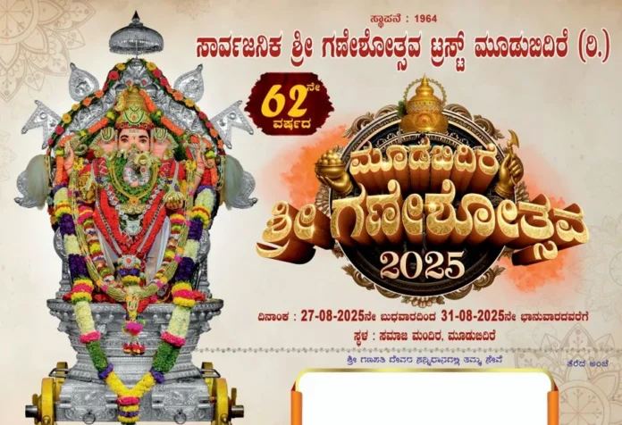 ಸರ್ವಧರ್ಮದವರೊಂದಿಗೆ ಮೂಡುಬಿದಿರೆ ಹಬ್ಬವಾಗಿ ಆಚರಿಸುವ ಗಣೇಶೋತ್ಸವ ಆ.26ರಂದು ಬೆಳಗ್ಗೆ 10ಕ್ಕೆ ಎಂಸಿಎಸ್ ಸೊಸೈಟಿ ಎದುರು ಮೆರವಣಿಗೆಗೆ ಚಾಲನೆ ನೀಡಲಾಗುವುದು. ಬೆಳ್ಳಿಯ ರಥ, ದೇವರ ಪ್ರಭಾವಳಿಯನ್ನು ತರಲಾಗುವುದು. ಎಂಸಿಎಸ್ ಬ್ಯಾಂಕ್ ವಿಶೇಷ ಕರ್ತವ್ಯಾಧಿಕಾರಿ ಚಂದ್ರಶೇಖರ್ ಮೆರವಣಿಗೆಯ ನೇತೃತ್ವ ವಹಿಸಿದ್ದಾರೆ ಎಂದು ನಾರಾಯಣ ಪಿ.ಎಂ ತಿಳಿಸಿದರು.