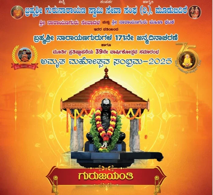 ಮೂಡುಬಿದಿರೆ: ಬ್ರಹ್ಮಶ್ರೀ ಗುರುನಾರಾಯಣ ಸ್ವಾಮಿ ಸೇವಾ ಸಂಘ (ರಿ.) ಮೂಡುಬಿದಿರೆ, ಶ್ರೀ ನಾರಾಯಣ ಗುರು ಸೇವಾದಳ ಮತ್ತು ಶ್ರೀ ನಾರಾಯಣಗುರು ಮಹಿಳಾ ಘಟಕ ಇದರ ವತಿಯಿಂದ ಬ್ರಹ್ಮಶ್ರೀ ನಾರಾಯಣ ಗುರುಗಳ ೧೭೧ನೇ ಜನ್ಮ ದಿನಾಚರಣೆ ಹಾಗೂ ಮೂರ್ತಿ ಪ್ರತಿಷ್ಠಾಪನೆಯ ೩೯ನೇ ವಾರ್ಷಿಕೋತ್ಸವ ಸಮಾರಂಭ, ಗುರುಜಯಂತಿ ಕಾರ್ಯಕ್ರಮವು ಸೆ. 7ರಂದು ಮೂಡುಬಿದಿರೆ ಬ್ರಹ್ಮಶ್ರೀ ಗುರುನಾರಾಯಣ ಸ್ವಾಮಿ ಸೇವಾ ಸಂಘ ಕಾಮಧೇನು ಸಭಾಭವನದಲ್ಲಿ ನಡೆಯಲಿದೆ.
