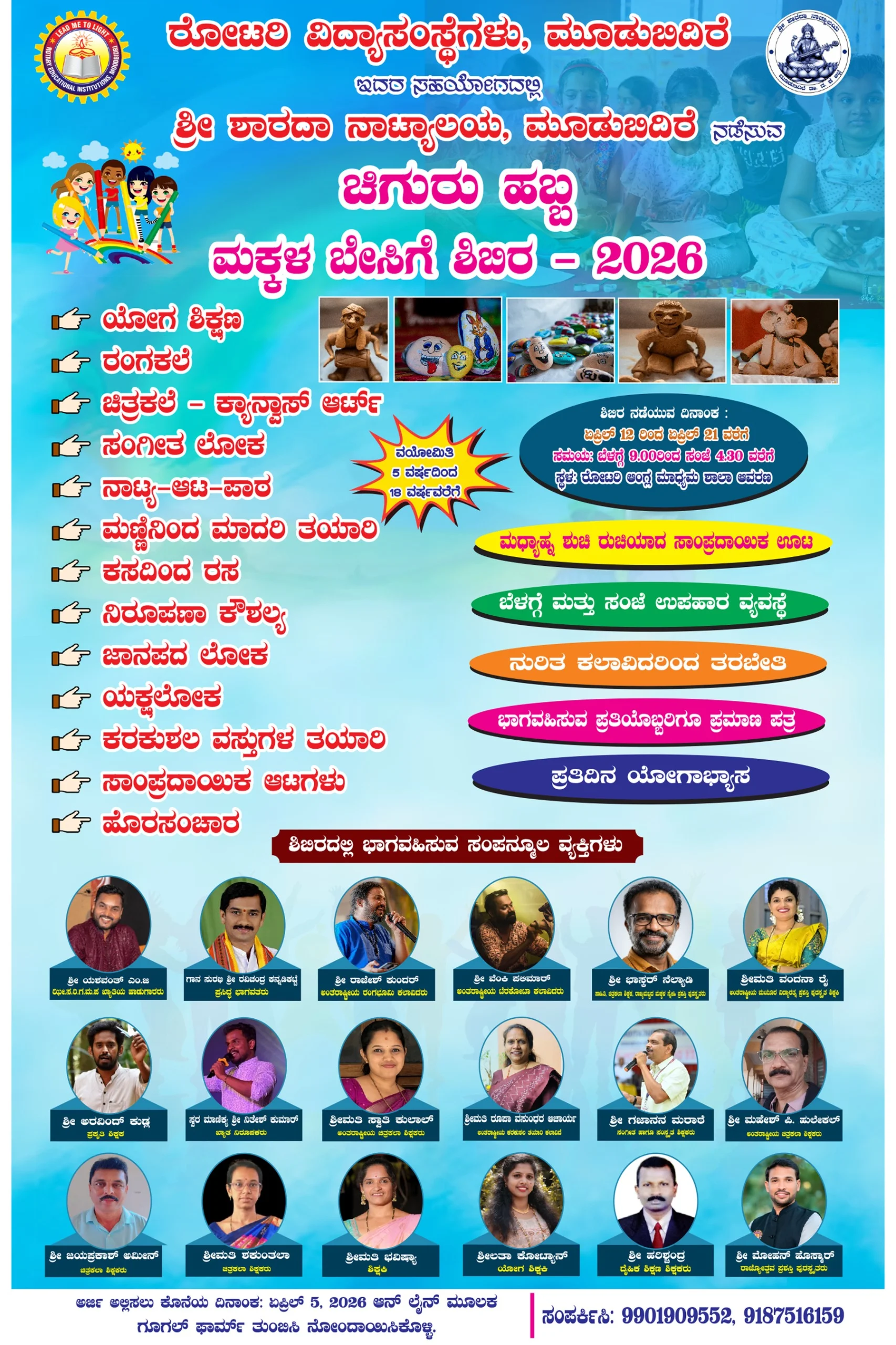 ರೋಟರಿ ಆಂಗ್ಲ ಮಾಧ್ಯಮ ಶಾಲೆ ಮೂಡುಬಿದಿರೆ ಇದರ ಸಹಯೋಗದಲ್ಲಿ ಶ್ರೀ ಶಾರದಾ ನಾಟ್ಯಾಲಯ ಮೂಡುಬಿದಿರೆ ನಡೆಸುವ ಚಿಗುರು ಹಬ್ಬ ಮಕ್ಕಳ ಬೇಸಿಗೆ ಶಿಬಿರ 2026 ಇದೇ ಬರುವ ಏಪ್ರಿಲ್ 12 ರಿಂದ ಏಪ್ರಿಲ್ 21 ರವರೆಗೆ 10 ದಿನಗಳ ಕಾಲ ರೋಟರಿ ಆಂಗ್ಲ ಮಾಧ್ಯಮ ಶಾಲಾ ಆವರಣದಲ್ಲಿ ನಡೆಯಲಿದೆ. ಈ ಶಿಬಿರದಲ್ಲಿ ನಾಡಿನ ಹೆಸರಾಂತ ಕಲಾವಿದರು ಸಂಪನ್ಮೂಲ ವ್ಯಕ್ತಿಯಾಗಿ ಶಿಬಿರದಲ್ಲಿ ಭಾಗವಹಿಸಲಿದ್ದಾರೆ. ಶಿಬಿರದಲ್ಲಿ ಯೋಗ, ರಂಗ ಕಲೆ, ಚಿತ್ರಕಲೆ, ಜಾನಪದ ಲೋಕ, ಸಂಗೀತ ಲೋಕ, ಯಕ್ಷಲೋಕ, ಪಕ್ಷಿ ಪ್ರಪಂಚ , ಮಣ್ಣಿನಿಂದ ಮಾದರಿ ತಯಾರಿ, ಕಸದಿಂದ ರಸ , ಕರಕುಶಲ ವಸ್ತುಗಳ ತಯಾರಿ, ನಾಟ್ಯ-ಆಟ-ಪಾಠ, ಸಾಂಪ್ರದಾಯಿಕ ಆಟಗಳು, ಹೊರಸಂಚಾರ ಹೀಗೆ ವಿಭಿನ್ನ ರೀತಿಯ ಚಟುವಟಿಕೆಗಳು ನುರಿತ ಕಲಾವಿದರಿಂದ ಮೂಡಿ ಬರಲಿದೆ. ಶ್ರೀ ಶಾರದಾ ನಾಟ್ಯಾಲಯದ ನಿರ್ದೇಶಕ ರಾಜ್ಯೋತ್ಸವ ಪ್ರಶಸ್ತಿ ವಿಜೇತ ಶ್ರೀ ಮೋಹನ್ ಹೊಸ್ಮಾರ್ ಇವರ ನಿರ್ದೇಶನದಲ್ಲಿ ಈ ಶಿಬಿರವು ನಡೆಯಲಿದೆ. ಹೆಚ್ಚಿನ ಸಂಖ್ಯೆಯಲ್ಲಿ ವಿದ್ಯಾರ್ಥಿಗಳು ಈ ಶಿಬಿರದ ಸದುಪಯೋಗ ಪಡೆದುಕೊಳ್ಳುವಂತೆ ಮನವಿ ಮಾಡಿದ್ದಾರೆ.