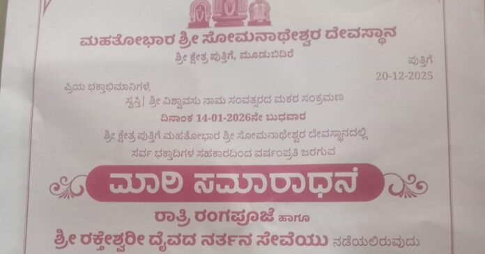 ದಿನಾಂಕ 20-12-2025 ರಂದು ಮಹತೋಭಾರ ಶ್ರೀ ಸೋಮನಾಥೇಶ್ವರ ದೇವಸ್ಥಾನ ಶ್ರೀ ಕ್ಷೇತ್ರ ಪುತ್ತಿಗೆ, ಮೂಡುಬಿದಿರೆ ಇಲ್ಲಿ ಮಾರಿ ಸಮಾರಾಧನೆ , ರಾತ್ರಿ ರಂಗಪೂಜೆ ಹಾಗೂ ಶ್ರೀ ರಕೇಶ್ವರೀ ದೈವದ ನರ್ತನ ಸೇವೆ ನಡೆಯಲಿರುವುದು .