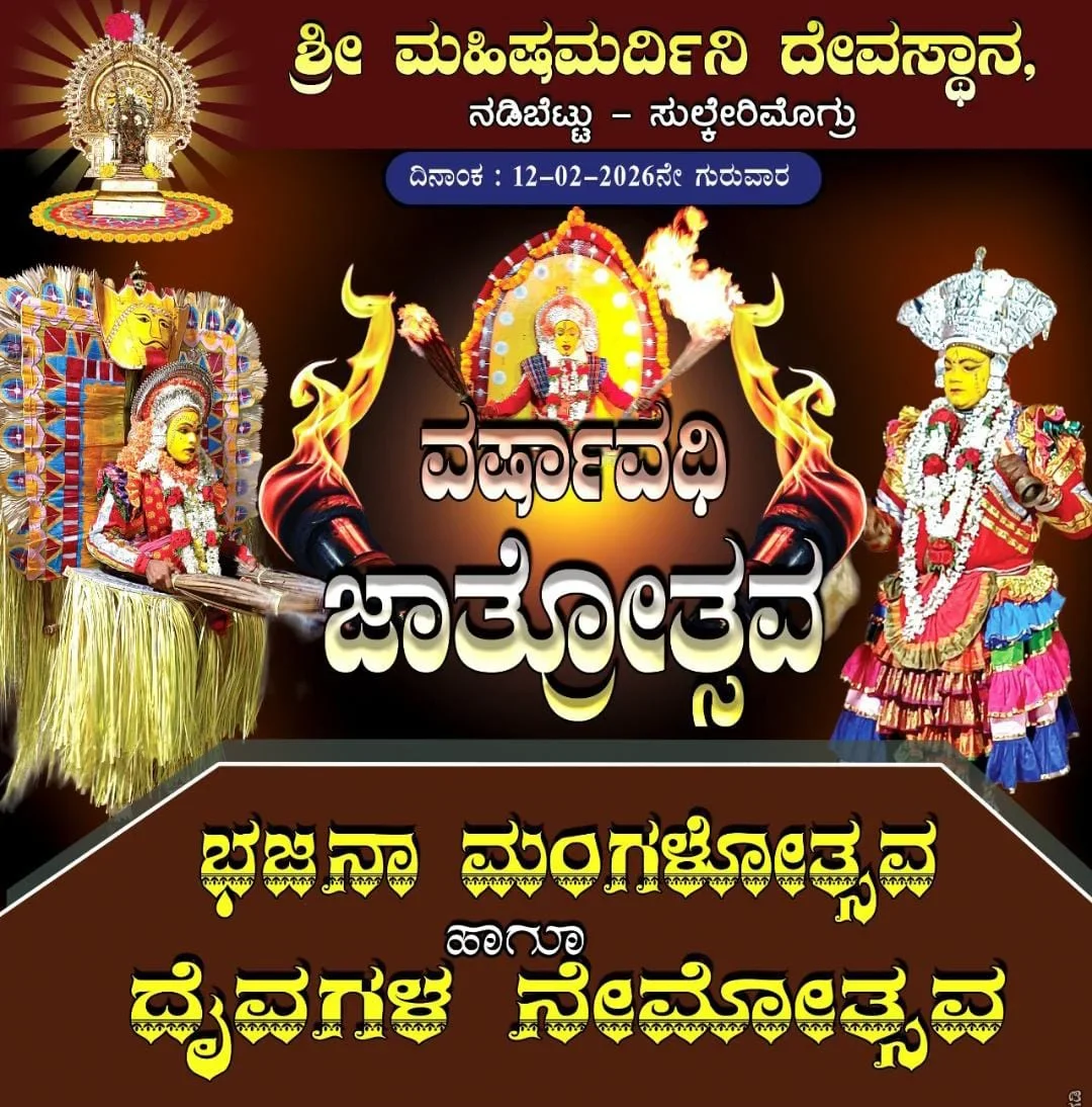 ಶ್ರೀ ಮಹಿಷಮರ್ದಿನಿ ದೇವಸ್ಥಾನ, ನಡಿಬೆಟ್ಟು – ಸುಲ್ಲೇರಿಮೊಗ್ರು ದಿನಾಂಕ 12-02-2026ನೇ ಗುರುವಾರ ವರ್ಷಾವಧಿ ಜಾತ್ರೋತ್ಸವ, ಭಜನಾ ಮಂಗಳೋತ್ಸವ ಹಾಗೂ ದೈವಗಳ ನೇಮೋತ್ಸವವು ನಡೆಯಲಿದೆ.