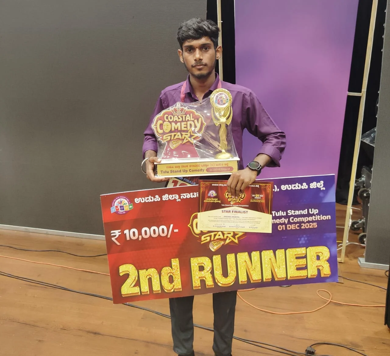 ಮುನಿಯಾಲು : ಪ್ರತಿಭಾವಂತ ಯುವ ಕಲಾವಿದ ಮುನಿಯಾಲಿನ ನಾಗರಾಜ್ ಕಾಡುಹೊಳೆ ಅವರಿಗೆ ಉಡುಪಿ ಯಕ್ಷಗಾನ ಕಲಾರಂಗದಲ್ಲಿ ಡಿಸೆಂಬರ್ ೧ ರಂದು ಉಡುಪಿ ಜಿಲ್ಲಾ ನಾಟಕ ಕಲಾವಿದರ ಒಕ್ಕೂಟ ( ರಿ ) ಅರ್ಪಿಸಿದ ಕೋಸ್ಟಲ್ ಕಾಮಿಡಿ ಸ್ಟಾರ್ ತುಳು ಸ್ಟ್ಯಾಂಡ್ ಅಫ್ ಕಾಮಿಡಿ ಸ್ಪರ್ಧೆಯಲ್ಲಿ ೨ನೇ ರನ್ನರ್ ಆಪ್ ಪ್ರಶಸ್ತಿಯು ದೊರೆತಿದೆ. ಬದುಕಿನ ನಾಳೆಗಾಗಿ ಕಠಿಣ ಶ್ರಮವಹಿಸುವ ಕಾಯಕಜೀವಿ ನಾಗರಾಜ್ ಕಾಡುಹೊಳೆ ಎಳವೆಯಿಂದಲೇ ಪ್ರತಿಭಾವಂತ. ಕಲಾ ಕ್ಷೇತ್ರದತ್ತ ಆಕರ್ಷಿತರಾದ ಕಾರ್ಕಳ ತಾಲೂಕಿನ ಅಜೆಕಾರು ಸಮೀಪದ ನಾಗರಾಜ್ ಕಾಡುಹೊಳೆ ಹಾಸ್ಯಮಯ ಸಾಮಾಜಿಕ ನಾಟಕ ” ಕಾಲ ಬದಲಾತುಂಡು ” ನ್ನು ರಚನೆ ಮಾಡಿ ನಿರ್ದೇಶಿಸಿ ಅಭಿನಯಿಸಿ ನಾಟಕ ಕಲಾರಂಗಕ್ಕೆ ಪ್ರಥಮ ಕಾಣಿಕೆ ನೀಡಿದ್ದಾರೆ. ಮುನಿಯಾಲಿನಲ್ಲಿ ಪ್ರಥಮ ಪ್ರದರ್ಶನ ಕೂಡ ಕಂಡಿದೆ. ದೈಜಿವಲ್ಡ್ ಮಾಧ್ಯಮ ಸಂಸ್ಥೆಯ ಕಾಮಿಡಿ ರಾಜರಾಣಿ ಸ್ಪರ್ಧೆಯಲ್ಲಿ ಭಾಗವಹಿಸಿ ಮನ್ನಣೆಗಳಿಸಿದ್ದಾರೆ. ಪ್ರಸ್ತುತ ಅಭಿಷೇಕ್ ಬಜಗೋಳಿ ಸಾರಥ್ಯದ ಬೊಳ್ಳಿ ಕಲಾವಿದೆರ್ ಬಜಗೋಳಿ ತಂಡದಲ್ಲಿ ಅಭಿನಯಿಸುತ್ತಿದ್ದಾರೆ.