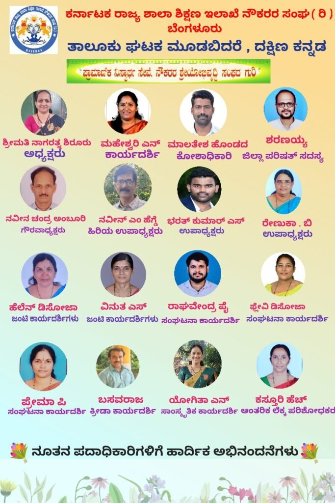 ಗೌರವಾಧ್ಯಕ್ಷರಾಗಿ ನವೀನ್ ಅಂಬೂರಿ, ಜಿಲ್ಲಾ ಪರಿಷತ್ ಸದಸ್ಯರಾಗಿ ಶರಣಯ್ಯ, ಹಿರಿಯ ಉಪಾಧ್ಯಕ್ಷರಾಗಿ ನವೀನ್ ಎಂ. ಹೆಗ್ಡೆ ಉಪಾಧ್ಯಕ್ಷರಾಗಿ, ಭರತ್ ಕುಮಾರ್ ಎಸ್., ರೇಣುಕಾ ಬಿ. ಅವರನ್ನು ಆಯ್ಕೆ ಮಾಡಲಾಯಿತು. ಜಂಟಿ ಕಾರ್ಯದರ್ಶಿಗಳಾಗಿ ಹೆಲೆನ್ ಡಿಸೋಜಾ, ವಿನುತ ಎಸ್., ಸಂಘಟನಾ ಕಾರ್ಯದರ್ಶಿಯಾಗಿ ರಾಘವೇಂದ್ರ ಪೈ, ಪ್ಲೇವಿ ಡಿಸೋಜ, ಪ್ರೇಮ ಪಿ., ಕ್ರೀಡಾ ಕಾರ್ಯದರ್ಶಿಯಾಗಿ ಬಸವರಾಜ್, ಸಾಂಸ್ಕೃತಿಕ ಕಾರ್ಯದರ್ಶಿಯಾಗಿ ಯೋಗಿತಾ ಎನ್., ಆಂತರಿಕ ಲೆಕ್ಕಪರಿಶೋಧಕರಾಗಿಕಸ್ತೂರಿ ಎಚ್. ಅವರನ್ನು ಆಯ್ಕೆ ಮಾಡಲಾಯಿತು. ಜಿಲ್ಲಾಧ್ಯಕ್ಷರಾದ ಪ್ರೇಮನಾಥ ಶೆಟ್ಟಿ ಮತ್ತು ಜಿಲ್ಲಾ ಸಂಘಟನಾ ಕಾರ್ಯದರ್ಶಿಯಾದ ಮೋಹನ ಕೊನವಳ್ಳಿ ಅವರ ಮಾರ್ಗದರ್ಶನದಲ್ಲಿ ಸಭೆ ನಡೆಯಿತು. ಮೂಡುಬಿದಿರೆ ತಾಲೂಕು ಸರಕಾರಿ ನೌಕರರ ಸಂಘದ ಅಧ್ಯಕ್ಷರಾದ ಡಾ. ದೊರೆಸ್ವಾಮಿ ಕೆ.ಎನ್. ಅವರು ಸಭೆಯಲ್ಲಿ ಉಪಸ್ಥಿತರಿದ್ದರು.