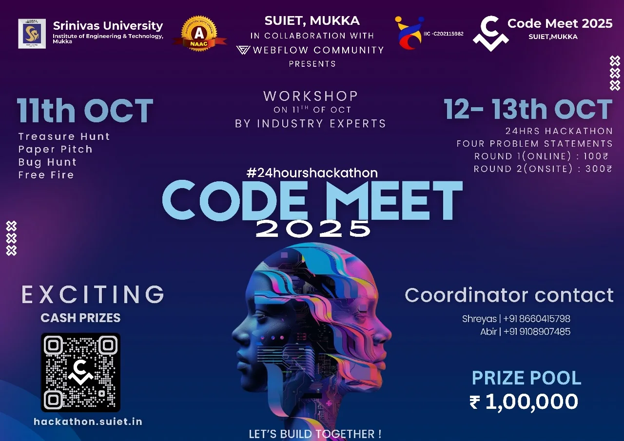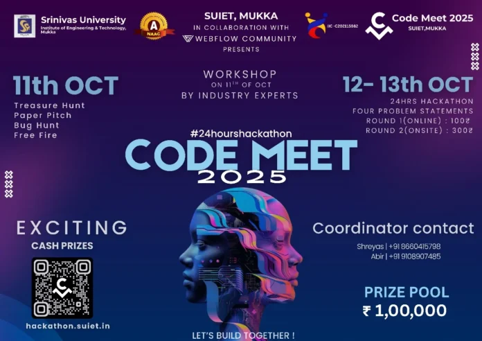 ಶ್ರೀನಿವಾಸ್ ಯೂನಿವರ್ಸಿಟಿ ಇನ್ಸ್ಟಿಟ್ಯೂಟ್ ಆಫ್ ಇಂಜಿನಿಯರಿಂಗ್ ಆಂಡ್ ಟೆಕ್ನಾಲಜಿ ಮತ್ತು ವೆಬ್ಫ್ಲೋ ಸಮುದಾಯದ ಸಹಯೋಗದಲ್ಲಿ ತಂತ್ರಜ್ಞಾನ ಆಧಾರಿತ ಮೂರು ದಿನಗಳ ರಾಷ್ಟ್ರೀಯ ಮಟ್ಟದ “ಕೋಡ್ ಮೀಟ್ 2025” ಹ್ಯಾಕಥಾನ್ ಸ್ಪರ್ಧೆಯನ್ನು ಅಕ್ಟೋಬರ್ 11-12-13 ರಂದು ಆಯೋಜಿಸಲಾಗುವುದು. ಈ ಮೂರು ದಿನಗಳ ರಾಷ್ಟ್ರೀಯ ಮಟ್ಟದ ಹ್ಯಾಕಥಾನ್ ಸ್ಪರ್ಧೆಯಲ್ಲಿ ದೇಶದ ವಿವಿಧ ರಾಜ್ಯಗಳಿಂದ ಇಂಜಿನಿಯರಿಂಗ್ ವಿದ್ಯಾರ್ಥಿಗಳು ಭಾಗವಹಿಸಲಿದ್ದು, ತಂತ್ರಜ್ಞಾನ ಮತ್ತು ನಾವೀನ್ಯತೆಯ ಸಂಯೋಜನೆಯೊಂದಿಗೆ ವಿವಿಧ ಸಮಸ್ಯೆಗಳಿಗೆ ಪರಿಹಾರವನ್ನು ಕಂಡುಕೊಳ್ಳಲಿದ್ದಾರೆ.
