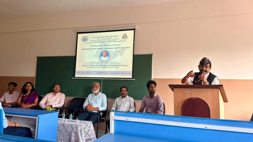 ಮಂಗಳೂರು : ಭಾರತದ ಲೋಹಪುರುಷ, ರಾಷ್ಟ್ರೀಯ ಏಕತಾ ಶಿಲ್ಪಿ, ಭಾರತ ರತ್ನ ಶ್ರೀ ಸರ್ದಾರ್ ವಲ್ಲಭಾಯಿ ಪಟೇಲ್ ಅವರ 150ನೇ ಜನ್ಮದಿನದ ಅಂಗವಾಗಿ,ಅಕ್ಟೋಬರ್ 30 – 2025 ರಂದು ಎಸ್ ಸಿ ಎಸ್ ಪ್ರಥಮ ದರ್ಜೆ ಕಾಲೇಜಿನಲ್ಲಿ “ರಾಷ್ಟ್ರೀಯ ಏಕತಾ ದಿವಸ”ವನ್ನು ವಿದ್ಯಾರ್ಥಿಗಳ ಕಲ್ಯಾಣ ಪರಿಷತ್ತಿನ ಆಶ್ರಯದಲ್ಲಿ ಸುಂದರವಾಗಿ ಆಚರಿಸಲಾಯಿತು.ವಿದ್ಯಾರ್ಥಿಗಳು ಪ್ರಾರ್ಥನಾ ಗೀತೆಯೊಂದಿಗೆ ಕಾರ್ಯಕ್ರಮಕ್ಕೆ ಚಾಲನ ನೀಡಿದರು.