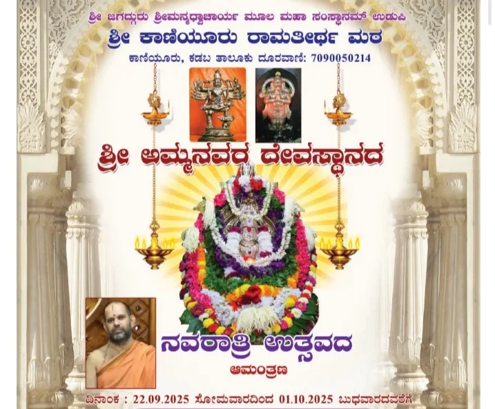 ಕಾಣಿಯೂರು: ಶ್ರೀ ಕಾಣಿಯೂರು ರಾಮತೀರ್ಥ ಮಠ ಶ್ರೀ ಅಮ್ಮನವರ ದೇವಸ್ಥಾನದದಲ್ಲಿ ನವರಾತ್ರಿ ನಡೆಯಲಿದೆ. ಶ್ರೀ ಶ್ರೀ ಶ್ರೀ ವಿದ್ಯಾವಲ್ಲಭ ತೀರ್ಥ ಶ್ರೀಪಾದರು ಉಡುಪಿ, ಶ್ರೀ ಕಾಣಿಯೂರು ರಾಮತೀರ್ಥ ಮಠ ಕಾಣಿಯೂರು ಇವರ ಆದೇಶದಂತೆ ದಿನಾಂಕ : 22.09.2025ನೇ ಸೋಮವಾರದಿಂದ ದಿನಾಂಕ 01.10.2025ನೇ ಬುಧವಾರದವರೆಗೆ ಕಾಣಿಯೂರು ಶ್ರೀ ಅಮ್ಮನವರ ದೇವಸ್ಥಾನದಲ್ಲಿ ನವರಾತ್ರಿ ಪೂಜೆ ಜರಗಲಿರುವುದು.