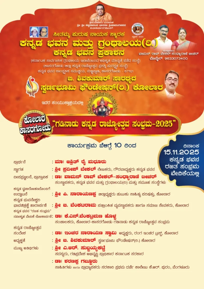 ಕಾಸರಗೋಡು : ನುಳ್ಳಿಪ್ಪಾಡಿಯ ಸೀತಮ್ಮ ಪುರುಷ ನಾಯಕ ಕನ್ನಡ ಭವನ ಮತ್ತು ಗ್ರಂಥಾಲಯ, ಕನ್ನಡ ಭವನ ಪ್ರಕಾಶನ ಮತ್ತು ಬಿ ಶಿವಕುಮಾರ ನೇತೃತ್ವದ ಕೋಲಾರದ ಸ್ವರ್ಣಭೂಮಿ ಫೌಂಡೇಶನ್ ಜಂಟಿ ಆಶ್ರಯದಲ್ಲಿ ನ.15ರಂದು ಬೆಳಗ್ಗೆ 10ರಿಂದ ಕಾಸರಗೋಡಿನ ಕನ್ನಡ ಭವನದ ರಜತ ಸಂಭ್ರಮ ವೇದಿಕೆಯಲ್ಲಿ ಕೋಲಾರ-ಕಾಸರಗೋಡು ಗಡಿನಾಡ ಕನ್ನಡ ರಾಜ್ಯೋತ್ಸವ ಸಂಭ್ರಮ-2025 ನಡೆಯಲಿದೆ. ಕನ್ನಡ ಭವನದ ಸ್ಥಾಪಕಾಧ್ಯಕ್ಷ ಡಾ. ವಾಮನ್ ರಾವ್ ಬೇಕಲ್- ಸಂಧ್ಯಾರಾಣಿ ಟೀಚರ್ ದೀಪ ಬೆಳಗಿಸಿ, ಪ್ರಾಸ್ತಾವಿಕವಾಗಿ ಮಾತನಾಡುವರು. ಕೋಲಾರದ ಪಿ. ನಾರಾಯಣಪ್ಪ ಕನ್ನಡ ಧ್ವಜಾರೋಹಣದೊಂದಿಗೆ ಉದ್ಘಾಟಿಸುವರು. ಸಮಾಜ ಸೇವಕ ಬಿ. ವೆಂಕಟರಾಮಯ್ಯ ಕೋಲಾರ ಅವರು ಕನ್ನಡ ಭುವನೇಶ್ವರಿಯ ಭಾವಚಿತ್ರಕ್ಕೆ ಹಾರಾರ್ಪಣೆ ಮಾಡುವರು. ಡಾ. ಕೆ ಎನ್ ವೆಂಕಟ್ರಮಣ ಹೊಳ್ಳ ಅವರು ಕನ್ನಡ ಭವನದ ನವೀಕೃತ ರಜತ ಸಂಭ್ರಮ ವೇದಿಕೆಯನ್ನು ಲೋಕಾರ್ಪಣೆ ಮಾಡುವರು. ಕೋಲಾರದ ರಂಗ ಇಂಚರ ಟ್ರಸ್ಟ್ ಅಧ್ಯಕ್ಷ ಡಾ. ಇಂಚರ ನಾರಾಯಣ ಸ್ವಾಮಿ ಅವರು ಕನ್ನಡ ರಾಜ್ಯೋತ್ಸವ ಸಂದೇಶ ನೀಡುವರು. ಬಿ. ಶಿವಕುಮಾರ ಕೋಲಾರ ಸಭೆಯ ಅಧ್ಯಕ್ಷತೆ ವಹಿಸುವರು. ಸಭೆಯಲ್ಲಿ ಕರ್ನಾಟಕ ಸರಕಾರದ ಗಡಿ ಪ್ರದೇಶ ಅಭಿವೃದ್ಧಿ ಪ್ರಾಧಿಕಾರದ ಸದಸ್ಯ ಎ ಆರ್ ಸುಬ್ಬಯ್ಯಕಟ್ಟೆ, ಪ್ರಾಧ್ಯಾಪಕ ಡಾ. ಶರಣಪ್ಪ ಗಬ್ಬೂರ್, ಕೊಡಗು ಕನ್ನಡ ಭವನದ ಅಧ್ಯಕ್ಷ ಬೊಳ್ಳಜಿರ ಬಿ ಅಯ್ಯಪ್ಪ, ಸಾಹಿತಿ ರುಬೀನಾ ಎಂ ಎ, ಸಾಮಾಜಿಕ ಮುಖಂಡರಾದ ಗೋಪಾಲ ಶೆಟ್ಟಿ ಅರಬೈಲು, ಶ್ರೀಧರ ಶೆಟ್ಟಿ ಮುಟ್ಟಂ, ಕಾಸರಗೋಡಿನ ಕಾರ್ಯನಿರತ ಪತ್ರಕರ್ತರ ಸಂಘದ ಅಧ್ಯಕ್ಷ ರವಿ ನಾಯ್ಕಾಪು, ಕಾರ್ಯದರ್ಶಿ ಗಂಗಾಧರ ತೆಕ್ಕೆಮೂಲೆ, ದಾಸ ಸಂಕೀರ್ತನಕಾರ ಜಯಾನಂದ ಕುಮಾರ ಹೊಸದುರ್ಗ, ಪ್ರಾಂಶುಪಾಲ ಕೆ ಪಿ ರಾಜೇಶ್ಚಂದ್ರ, ಕನ್ನಡ ಭವನದ ಕಾರ್ಯದರ್ಶಿ ವಸಂತ ಕೆರೆಮನೆ, ಪತ್ರಕರ್ತ ಪ್ರದೀಪ್ ಬೇಕಲ್, ಸಾಹಿತಿ ವಿರಾಜ್ ಅಡೂರು, ಆಶ್ರಿತ್ ರೈ ಮಧೂರು ಭಾಗವಹಿಸುವರು. ಕಾರ್ಯಕ್ರಮದಲ್ಲಿ ವಿವಾಹ ರಜತ ಸಂಭ್ರಮದಲ್ಲಿರುವ ಡಾ. ಕೆ ಎನ್ ವೆಂಕಟ್ರಮಣ ಹೊಳ್ಳ – ರೂಪಕಲಾ ದಂಪತಿಯನ್ನು ಗೌರವಿಸಲಾಗುವುದು. 25 ಮಂದಿ ಮುತೈದೆಯರಿಗೆ ಬಾಗಿನ ಸಮರ್ಪಣೆ ನಡೆಯಲಿದೆ. ಅಪರಾಹ್ನ 1ರಿಂದ ಸಾಹಿತಿ, ಪತ್ರಕರ್ತ ವಿರಾಜ್ ಅಡೂರು ಅವರ ಅಧ್ಯಕ್ಷತೆಯಲ್ಲಿ ಚುಟುಕು ಕವಿಗೋಷ್ಠಿ ನಡೆಯಲಿದೆ. ಸುಮಾರು 20 ಮಂದಿ ಕವಿಗಳು ಭಾಗವಹಿಸಲಿದ್ದಾರೆ. ಡಾ. ಶರಣಪ್ಪ ಗಬ್ಬೂರ್ ಉದ್ಘಾಟಿಸುವರು. ಪಿ. ನಾರಾಯಣಪ್ಪ, ದೇವರಾಜ್ ಆಚಾರ್ಯ ಸೂರಂಬೈಲು, ಶಶಿಕಲಾ ಟೀಚರ್ ಕುಂಬಳೆ ಸಹಕರಿಸುವರು.