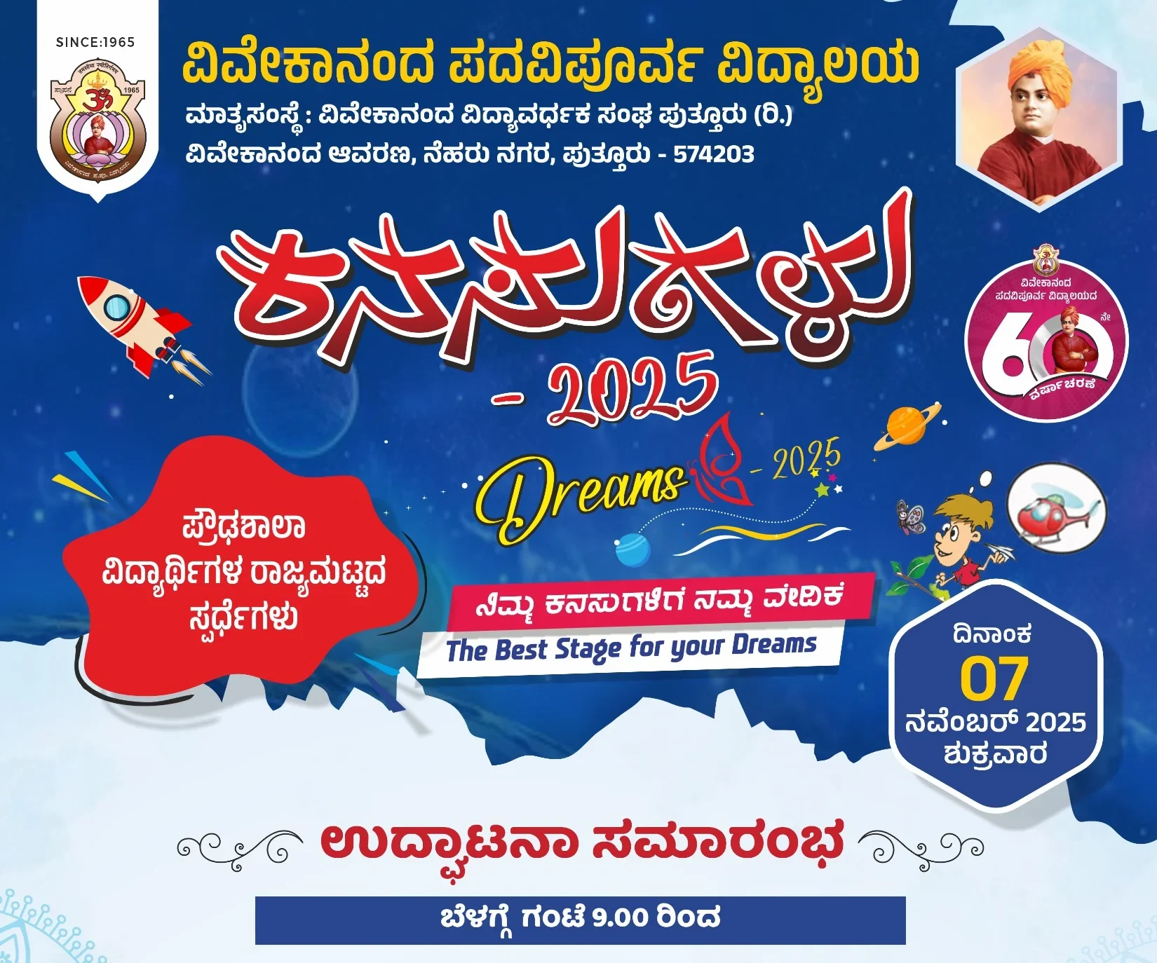 ವಿವೇಕಾನಂದ ಪದವಿಪೂರ್ವ ವಿದ್ಯಾಲಯದಲ್ಲಿ ಪ್ರೌಢಶಾಲಾ ವಿದ್ಯಾರ್ಥಿಗಳಿಗಾಗಿ ನಡೆಸುವ ರಾಜ್ಯಮಟ್ಟದ “ಕನಸುಗಳು – 2025”ನವಂಬರ್ 7ನೇಶುಕ್ರವಾರನಡೆಯಲಿದೆ. ಕನಸುಗಳು ಕಾರ್ಯಕ್ರಮದ ಉದ್ಘಾಟನಾಸಮಾರಂಭಬೆಳಗ್ಗೆ 9 ರಿಂದನಡೆಯಲಿದ್ದು, ಕಾರ್ಯಕ್ರಮದ ಅಧ್ಯಕ್ಷತೆಯನ್ನು ವಿವೇಕಾನಂದ ಪದವಿಪೂರ್ವ ಕಾಲೇಜಿನ ಆಡಳಿತಮಂಡಳಿಯ ನಿರ್ದೇಶಕರಾದ ಡಾ.ಕೃಷ್ಣಪ್ರಸನ್ನ ಕೆ. ಇವರು ವಹಿಸಿಕೊಳ್ಳಲಿದ್ದಾರೆ. ಕಾರ್ಯಕ್ರಮದ ಉದ್ಘಾಟನೆಯನ್ನು ವಿವೇಕಾನಂದ ವಿದ್ಯಾವರ್ಧಕ ಸಂಘದ ಜೊತೆ ಕಾರ್ಯದರ್ಶಿಗಳಾದ ರೂಪಲೇಖಾ ನಡೆಸಿಕೊಡಲಿದ್ದಾರೆ. ಸಭಾಕಾರ್ಯಕ್ರಮದ ಬಳಿಕ ಪ್ರೌಢಶಾಲಾ ವಿದ್ಯಾರ್ಥಿಗಳಿಗಾಗಿ ಹಲವು ರೀತಿಯ ಸ್ಪರ್ಧೆಗಳು ನಡೆಯಲಿದ್ದು, ಸಾಮಾನ್ಯ ರಸಪ್ರಶ್ನೆ, ವಿಜ್ಞಾನ ಮಾದರಿ, ಜಾಹೀರಾತು, ಚಿತ್ರಕಲೆ, ಕನ್ನಡ ಕವನರಚನೆ ಮತ್ತು ವಾಚನ, ಪ್ರಾಕೃತಿಕ ರಂಗೋಲಿ, ಯುವಪತ್ರಕರ್ತ, ಯುವ ವಾಣಿಜ್ಯೋದ್ಯಮಿ, ಮುಖವರ್ಣಿಕೆ, ವೀಡಿಯೋ ಸಂಕಲನ, ಚರ್ಚಾಸ್ಪರ್ಧೆ, ಯಕ್ಷಗಾನ ಭಾಗವತಿಕೆ, ಕಲರವ ಸಾಂಸ್ಕೃತಿಕ ವೈವಿಧ್ಯ, ನಿಧಿಶೋಧ, ಭಗವದ್ಗೀತಾ ಕಂಠಪಾಠ ಮುಂತಾದ ಸ್ಪರ್ಧೆಗಳು ನಡೆಯಲಿವೆ. ಅಪರಾಹ್ನ 2.00 ಕ್ಕೆ ಕನಸುಗಳು ಕಾರ್ಯಕ್ರಮದ ಸಮಾರೋಪ ಸಮಾರಂಭ ನಡೆಯಲಿದೆ. ಕಾರ್ಯಕ್ರಮದ ಅಧ್ಯಕ್ಷತೆಯನ್ನು ವಿವೇಕಾನಂದ ಪದವಿಪೂರ್ವ ಕಾಲೇಜಿನ ಆಡಳಿತಮಂಡಳಿಯ ಅಧ್ಯಕ್ಷರಾದ ರವೀಂದ್ರಪಿಇವರು ವಹಿಸಿಕೊಳ್ಳಲಿದ್ದಾರೆ. ಕಾರ್ಯಕ್ರಮದ ಮುಖ್ಯ ಅತಿಥಿಗಳಾಗಿ ಬಿಗ್‌ಬಾಸ್ ಖ್ಯಾತಿಯ ವಾಯ್ಸ್ ಓವರ್ ಕಲಾವಿದ ಹಾಗೂ ವಿವೇಕಾನಂದ ಪದವಿಪೂರ್ವ ಕಾಲೇಜಿನ ಹಿರಿಯ ವಿದ್ಯಾರ್ಥಿ ಪ್ರದೀಪ್ ಬಡೆಕ್ಕಿಲ ಇವರು ಭಾಗವಹಿಸಲಿದ್ದಾರೆ.