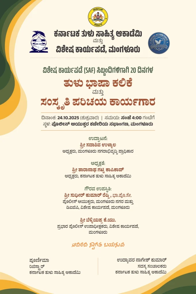ಅ.24 : ವಿಶೇಷ ಕಾರ್ಯಪಡೆ ಸಿಬ್ಬಂದಿಗಳಿಗಾಗಿ ತುಳು ಭಾಷಾ ಕಲಿಕೆ ಮತ್ತು ಸಂಸ್ಕೃತಿ ಪರಿಚಯ ಕಾರ್ಯಗಾರ ಉದ್ಘಾಟನೆ