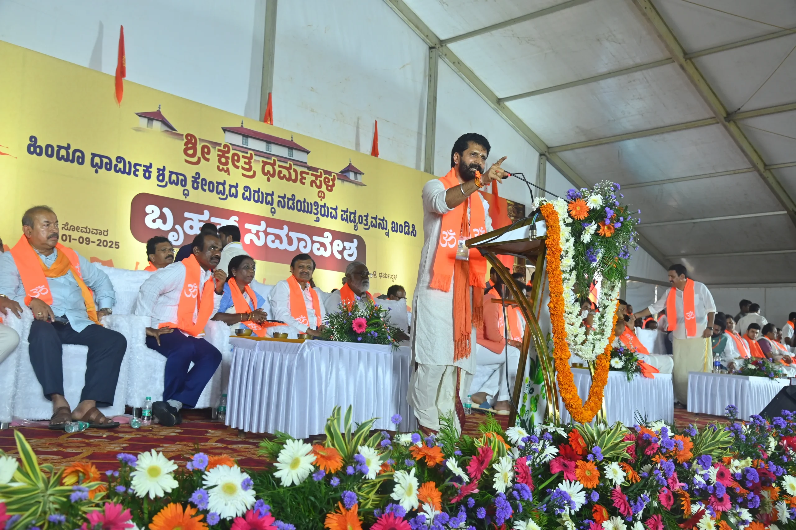 ಬಿ.ಜೆ.ಪಿ.ಯ ರಾಜ್ಯಾಧ್ಯಕ್ಷ ಬಿ.ವೈ. ವಿಜಯೇಂದ್ರ ಮಾತನಾಡಿ, ಹಿಂದೂ ಧಾರ್ಮಿಕ ಶ್ರದ್ಧಾಕೇಂದ್ರದ ವಿರುದ್ಧ ನಡೆಯುತ್ತಿರುವ ಷಡ್ಯಂತ್ರವನ್ನು ಖಂಡಿಸಿ ಧರ್ಮಸ್ಥಳದಲ್ಲಿ ಬೃಹತ್ ಸಮಾವೇಶ ಆಯೋಜಿಸಲಾಗಿದೆ.