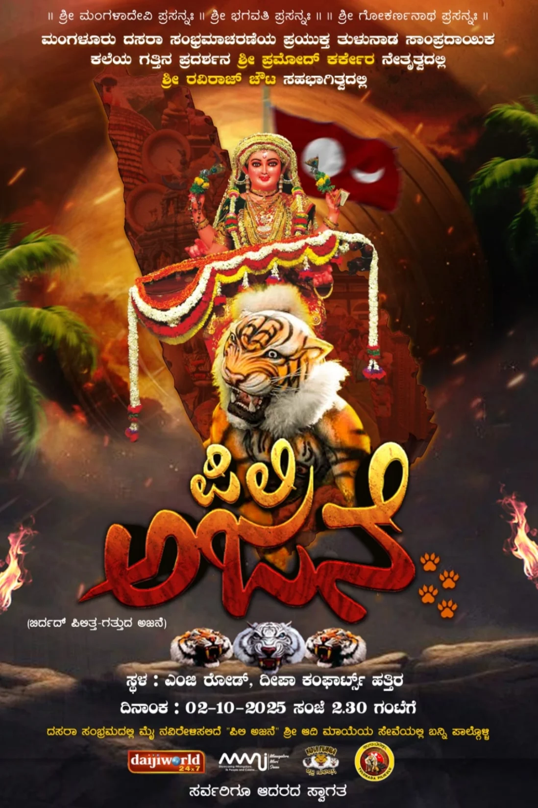 ಮಂಗಳೂರು ದಸರಾ ಸಂಭ್ರಮಾಚರಣೆಯ ಪ್ರಯುಕ್ತ ತುಳುನಾಡಿನ ಸಾಂಪ್ರದಾಯಿಕ ಕಲೆಯ ಗತ್ತಿನ ಪ್ರದರ್ಶನ ಪ್ರಮೋದ್ ಕರ್ಕೇರ ನೇತೃತ್ವದಲ್ಲಿ, ಶ್ರೀ ರವಿರಾಜ್ ಚೌಟ ಸಹಭಾಗಿತ್ವದಲ್ಲಿ ಪಿಲಿ ಅಜನೆ ಎಂಬ ಕಾರ್ಯಕ್ರಮವು ಮಂಗಳೂರು ನಗರದ ಕೋಡಿಯಾಲ್ ಬೈಲ್ ಎಂಜಿ ರೋಡ್ ದೀಪಾ ಕಂಫರ್ಟ್ಸ್ ಹತ್ತಿರ ಬಹಳ ವಿಜ್ರಂಭಣೆಯಿಂದ ಜರುಗಲಿದೆ. 4ನೇ ವರ್ಷದ ಪಿಲಿ ಅಜನೆ ಕಾರ್ಯಕ್ರಮವನ್ನು ಶಾಮಾ ರಾವ್ ಫೌಂಡೇಶನ್ ಮತ್ತು ಶ್ರೀನಿವಾಸ್ ಗ್ರೂಪ್ ಆಫ್ ಕಾಲೇಜ್ ನ ಕಾರ್ಯದರ್ಶಿ ಶ್ರೀಮತಿ ಎ. ಮಿತ್ರ ಎಸ್. ರಾವ್ ಉದ್ಘಾಟಿಸಲಿದ್ದಾರೆ. ಧಾರ್ಮಿಕ ಕಾರ್ಯಕ್ರಮದಲ್ಲಿ ಹಲವಾರು ಗಣ್ಯರು ಉಪಸ್ಥಿತರಿರಲಿದ್ದಾರೆ. ಮೈನವಿರೇಳಿಸಲಿರುವ ಈ ವಿಶೇಷವಾದ ಪಿಲಿ ಅಜನೆ ಎಂಬ ಕಾರ್ಯಕ್ರಮಕ್ಕೂ ಮುನ್ನ ಕುಣಿತ ಭಜನೆ, ಗೊಂಬೆ ಬಳಗ, ಚೆಂಡೆ ವಾದನ, ಹುಲಿ ಕುಣಿತದೊಂದಿಗೆ ಭವ್ಯ ಶೋಭಾಯಾತ್ರೆಯು ಜರುಗಲಿದೆ. ಶ್ರೀ ಮೂಕಾಂಬಿಕಾ ಚೆಂಡೆ ಹಾಗೂ ಶ್ರೀಜಿತ್ ಸರಳಾಯ ಮತ್ತು ಶ್ರೇಷ್ಠ ಕದ್ರಿ ಇವರಿಂದ ವಿಭಿನ್ನ ಶೈಲಿಯ ಚೆಂಡೆ-ವಾಯಲಿನ್-ಫ್ಯೂಶನ್ ಹಾಗೂ ಭಕ್ತಿ-ಭಾವದ ಮಹಾಸಂಗಮವಾಗಿ ಶ್ರೀ ಧರ್ಮಶಾಸ್ತ ಸನ್ನಿಧಿ ಭಜನಾ ತಂಡ ಕುಳೂರು ಇವರಿಂದ ಕುಣಿತ ಭಜನೆಯು ನಡೆಯಲಿದೆ. ಕಾರ್ಯಕ್ರಮದ ಕೇಂದ್ರಬಿಂದುವಾಗಿರುವ ದಕ್ಷಿಣ ಕನ್ನಡ ಜಿಲ್ಲೆಯಲ್ಲಿ ವಿವಿಧ ಭಾಗದಲ್ಲಿ ನಡೆದ ೨೦೨೩ರ ಸಾಲಿನ ಹುಲಿವೇಷ ಸ್ಪರ್ಧಾ ಕೂಟದಲ್ಲಿ ಭಾಗವಹಿಸಿ ಅಗ್ರಮಾನ್ಯ ಪ್ರಶಸ್ತಿ ಪಡೆದ ಜನಮೆಚ್ಚಿದ ತಂಡ ಮುಳಿಹಿತ್ಲು ಫ್ರೆಂಡ್ಸ್ ಸರ್ಕಲ್ (ರಿ.) ಜಗದಂಭ ಹುಲಿ ತಂಡದಿಂದ ಹುಲಿ ಕುಣಿತ ವಿಭಿನ್ನ ಕಾರ್ಯಕ್ರಮವು ಅತ್ಯಂತ ವೈಭವೋಪೇತವಾಗಿ ಜರುಗಲಿದೆ. ಈ ವರ್ಷದ ಪಿಲಿ ಅಜನೆ ಕಾರ್ಯಕ್ರಮದಲ್ಲಿ ವಿಶೇಷವಾಗಿ ಇತ್ತೀಚೆಗೆ ಗೋಲ್ಡನ್ ಬುಕ್ ಆಫ್ ವರ್ಲ್ಡ್ ರೆಕಾರ್ಡ್ಸ್ ಲಂಡನ್ ವಿಶ್ವ ದಾಖಲೆ ಮಾಡಿರುವ ರೆಮೊನಾ ಇವೆಟ್ ಪೆರೆರಾ – ಸನ್ಮಾನ ಕಾರ್ಯಕ್ರಮ, ಸಿಡಿಮದ್ದು ಪ್ರದರ್ಶನವು ಜರುಗಲಿದೆ.