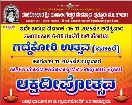 ಪುತ್ತೂರು: ಮಹತೋಭಾರ ಶ್ರೀ ಮಹಾಲಿಂಗೇಶ್ವರ ದೇವಸ್ಥಾನ, ದಿನಾಂಕ : 16-11-2025ನೇ ಆದಿತ್ಯವಾರ ಸಾಯಂಕಾಲ 6-00 ಗಂಟೆಗೆ ಬಲಿ ಹೊರಟು ಗದ್ದೆಕೋರಿ ಉತ್ಸವ (ಪೂಕರೆ) ಹಾಗೂ 19-11-2025ನೇ ಬುಧವಾರ ಕಾರ್ತಿಕ ಮಾಸದ ಅಮಾವಾಸ್ಯೆ ದಿನ ಸಂಪ್ರದಾಯ ಪ್ರಕಾರ ಲಕ್ಷದೀಪೋತ್ಸವ ವಿವಿಧ ಧಾರ್ಮಿಕ ಕಾರ್ಯಕ್ರಮಗಳೊಂದಿಗೆ ಜರಗಲಿರುವುದು.