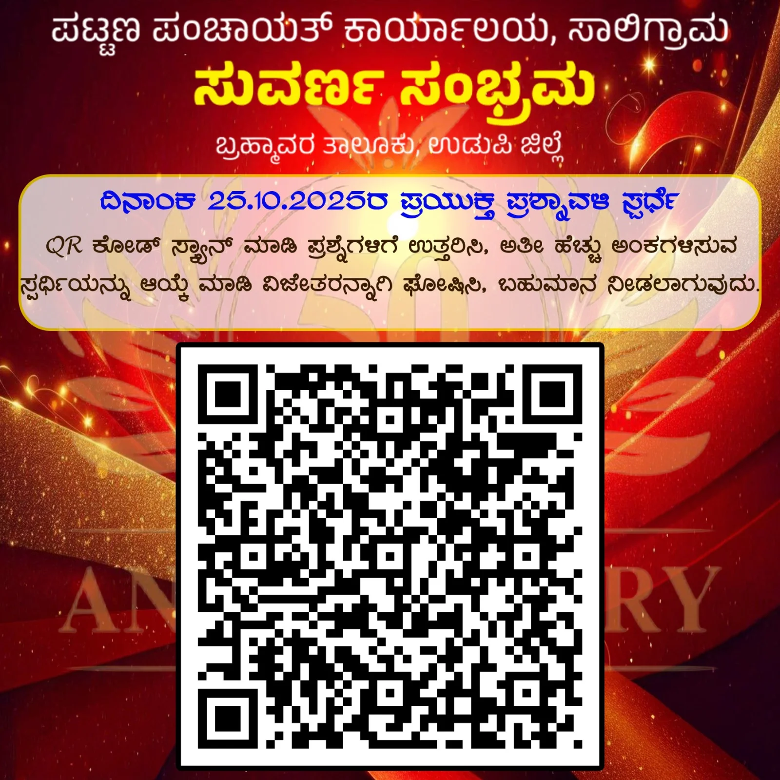 ಬ್ರಹ್ಮಾವರ ಸುವರ್ಣ ಸಂಭ್ರಮ @ 50 ರ ಪ್ರಯುಕ್ತ ಸಾಲಿಗ್ರಾಮ ಪಟ್ಟಣ ಪಂಚಾಯತ್ ನಾಗರಿಕರಿಗೆ Googal form Web Portal ಮುಖಾoತರ ಪ್ರಶ್ನಾವಳಿ ಸ್ಪರ್ಧೆಯನ್ನು ಆಯೋಜಿಸಲಾಗಿದ್ದು, ಸದ್ರಿ ಸ್ಪರ್ಧೆಯ ಕ್ಯೂ ಆರ್ ಕೋಡ್ ನ್ನು ಈ ದಿನ ಮಾನ್ಯ ಜಿಲ್ಲಾಧಿಕಾರಿಯವರು ಅನಾವರಣ ಮಾಡಿದ್ದು ಈ ಬಗ್ಗೆ ನಾಗರಿಕರು ಕ್ಯೂ ಆರ್ ಕೋಡ್ ನ್ನು ಸ್ಕಾನ್ ಮಾಡಿ ಪ್ರಶ್ನೆಗಳಿಗೆ ಉತ್ತರಿಸಿ. ಅತೀ ಹೆಚ್ಚು ಪ್ರಶ್ನೆಗೆ ಸರಿಯಾದ ಉತ್ತರ ನೀಡಿದವರಿಗೆ ದಿನಾಂಕ 25-10-20025 ರಂದು ಬಹುಮಾನವನ್ನು ನೀಡಲಾಗುವುದು.