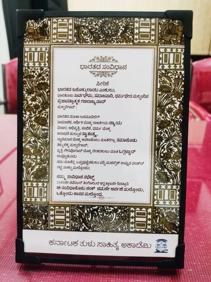 ಮಂಗಳೂರು : ಭಾರತ ಸಂವಿಧಾನದ ಪೀಠಿಕೆಯನ್ನು ಕರ್ನಾಟಕ ತುಳು ಸಾಹಿತ್ಯ ಅಕಾಡೆಮಿಯು ತುಳು ಭಾಷೆಗೆ ಭಾಷಾಂತರಿಸಿ ಪಠ್ಯದ ಫಲಕ ಬಿಡುಗಡೆ ಮಾಡಿದೆ.
