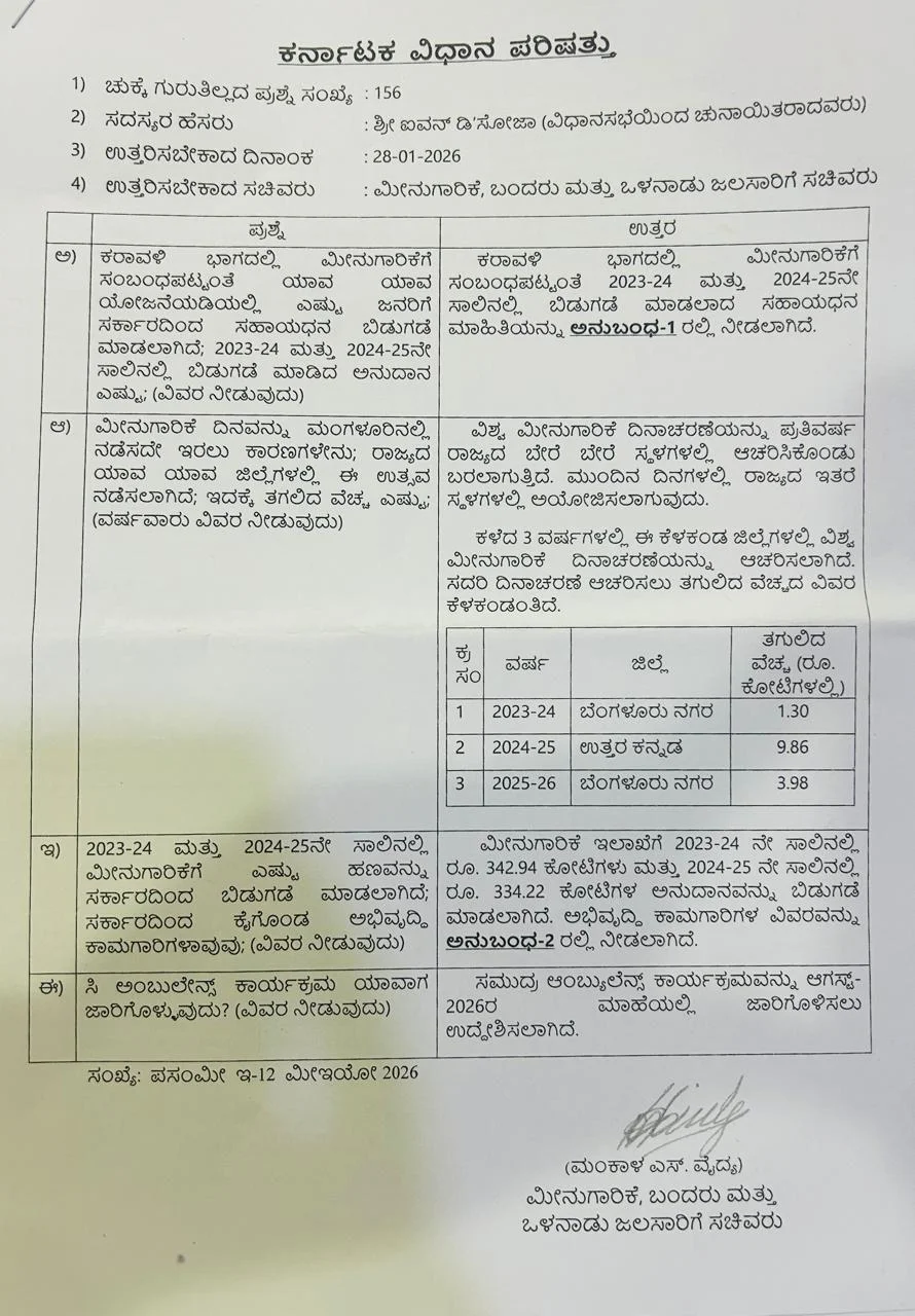 ಕರಾವಳಿ ಭಾಗದಲ್ಲಿ ಮೀನುಗಾರಿಕೆಗೆ ಸಂಬಂಧಪಟ್ಟಂತೆ ಯಾವ ಯಾವ ಯೋಜನೆಯಡಿಯಲ್ಲಿ ಎಷ್ಟು ಜನರಿಗೆ ಸರ್ಕಾರದಿಂದ ಸಹಾಯಧನ ಬಿಡುಗಡೆ ಮಾಡಲಾಗಿದೆ. 2023-24 ಮತ್ತು 2024-25ನೇ ಸಾಲಿನಲ್ಲಿ ಬಿಡುಗಡೆ ಮಾಡಿದ ಅನುದಾನ ಎಷ್ಟು ಸಿ ಅಂಬುಲೆಲ್ಸ್ ಕರ‍್ಯಕ್ರಮ ಯಾವಾಗ ಜಾರಿಗೊಳ್ಳುವುದು ? ಎಂಬ ವಿಧಾನಪರಿಷತ್ ಶಾಸಕರಾದ ಐವನ್ ಡಿʼಸೋಜಾರವರ ಪ್ರಶ್ನೆಗೆ ಉತ್ತರಿಸಿದ ಮೀನುಗಾರಿಕೆ ಬಂದರು ಮತ್ತು ಒಳನಾಡು ಸಚಿವರಾದ ಮಂಕಾಳೆಸ್. ವೈದ್ಯ ರವರ ಉತ್ತರ ಹೀಗಿತ್ತು ಮೀನಿಗಾರಿಕೆ ಇಲಾಖೆಗೆ 2023-24ನೇ ಸಾಲಿನಲ್ಲಿ ರೂ.334.94ಕೋಟಿ ಗಳ ಅನುದಾನ ಮತ್ತು 2024-25ನೇ ಸಾಲಿನಲ್ಲಿ ರೂ.334.22ಕೋಟಿಗಳ ಅನುದಾನವನ್ನು ಬಿಡುಗಡೆ ಮಾಡಲಾಗಿದೆ. ಸಮುದ್ರ ಅಂಬುಲೆನ್ಸ್ ಕರ‍್ಯಕ್ರಮವನ್ನು ಅಗಸ್ಟ್ 2026ರ ಮಾಹೆಯಲ್ಲಿ ಜಾರಿಗೊಳಿಸಲು ಉದ್ದೇಶಿಸಲಾಗಿದೆ. ಎಂದು ಸಚಿವರು ತಿಳಿಸಿದ್ದಾರೆ.
