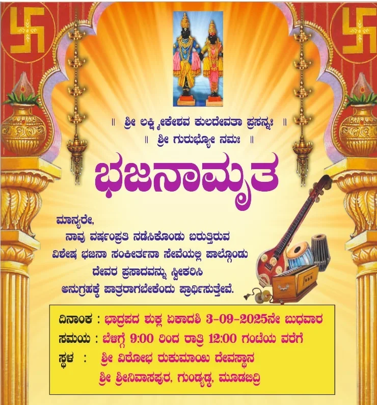 ದಕ್ಷಿಣ ಕನ್ನಡ :- ಮೂಡುಬಿದಿರೆ ಸಮೀಪದ ಶ್ರೀ ವಿಠೋಬಾ ರುಕುಮಾಯಿ ದೇವಸ್ಥಾನ ಶ್ರೀನಿವಾಸಪುರ ಗುಂಡ್ಯಡ್ಕ ಇಲ್ಲಿ 03.09.2025 ಬೆಳಿಗ್ಗೆ ಗಂಟೆ 9 ರಿಂದ ರಾತ್ರಿ ಗಂಟೆ 12ವರೆಗೆ “ಭಜನಾಮೃತ” ವಿಶೇಷ ಭಜನಾ ಸಂಕೀರ್ತನಾ ಸೇವೆ ನಡೆಯಲಿದ್ದು ಈ ಶುಭ ಕಾರ್ಯಕ್ರಮದಲ್ಲಿ ಭಕ್ತಾದಿಗಳು ಪಾಲ್ಗೊಂಡು ದೇವರ ಪ್ರಸಾದವನ್ನು ಸ್ವೀಕರಿಸಿ ಅನುಗ್ರಹಕ್ಕೆ ಪಾತ್ರರಾಗಬೇಕೆಂದು ಆಮಂತ್ರಣ ಪತ್ರ ಪ್ರಕಟಣೆಯಲ್ಲಿ ತಿಳಿಸಿದ್ದಾರೆ.