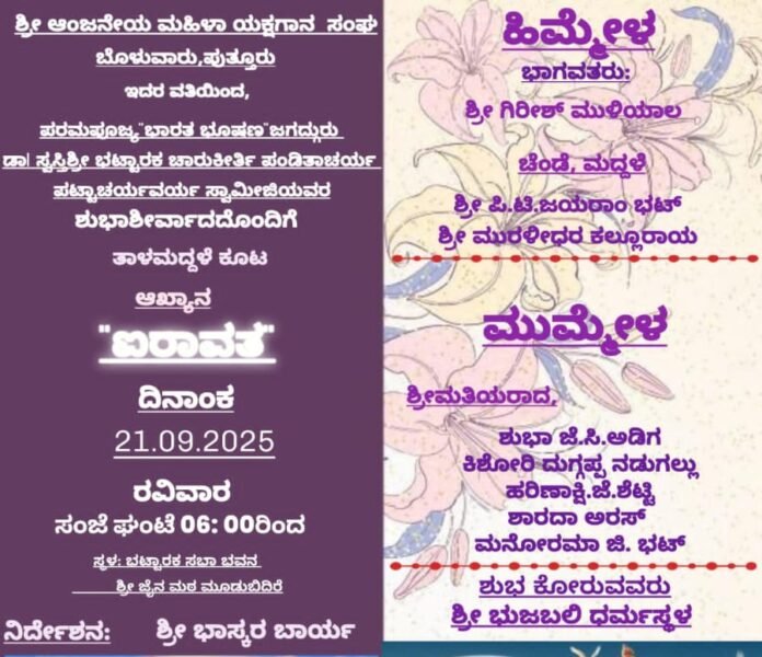 ತುಳುನಾಡು: ಆಂಜನೇಯ ಮಹಿಳಾ ಯಕ್ಷಗಾನ ಸಂಘ, ಬೋಳುವಾರು, ಪುತ್ತೂರು ಇವರ ವತಿಯಿಂದ ಪರಮಪೂಜ್ಯ ಭಾರತಭೂಷಣ ಜಗದ್ಗುರು ಡಾ. ಸ್ವಸ್ತಿಶ್ರೀ ಭಟ್ಟಾರಕ ಚಾರುಕೀರ್ತಿ ಪಂಡಿತಾಚಾರ್ಯ ಮಹಾಸ್ವಾಮಿಗಳ ಆಶೀರ್ವಾದದೊಂದಿಗೆ “ಐರಾವತ” ಎಂಬ ಯಕ್ಷಗಾನ ತಾಳಮದ್ದಳೆ ಕಾರ್ಯಕ್ರಮವನ್ನು ಸೆ 21ರಂದು ಆಯೋಜಿಸಲಾಗಿದೆ.