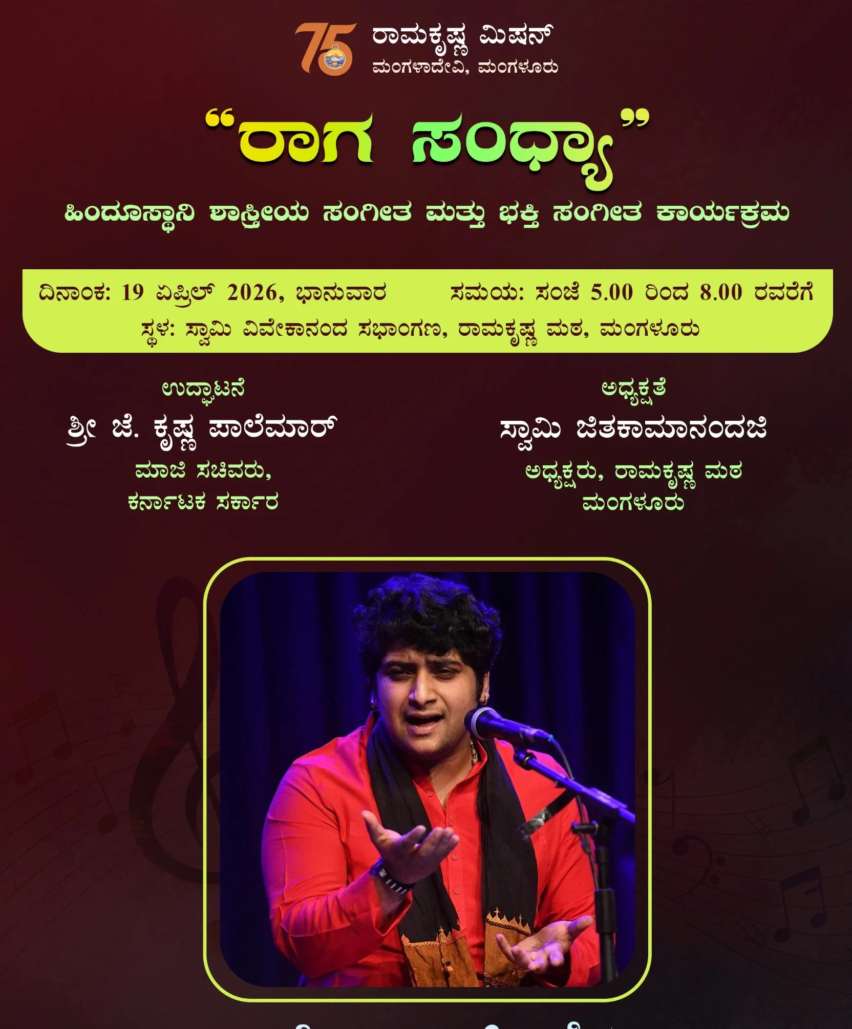 ಮಂಗಳೂರು: ರಾಮಕೃಷ್ಣ ಮಿಷನ್ ಮಂಗಳೂರು ವತಿಯಿಂದ ಸಂಸ್ಥೆಯ 75ನೇ ವರ್ಷದ ಅಂಗವಾಗಿ ವಿಶೇಷ ಭಕ್ತಿಸಂಗೀತಕಾರ್ಯಕ್ರಮ“ರಾಗ ಸಂಧ್ಯಾ” ವನ್ನುಏರ್ಪಡಿಸಲಾಗಿದೆ. ಈ ಸಂಗೀತ ಕಾರ್ಯಕ್ರಮವು ಏಪ್ರಿಲ್ 19, 2026, ಭಾನುವಾರ ಸಂಜೆ 5.00 ರಿಂದ 8.00 ಗಂಟೆಯವರೆಗೆಸ್ವಾಮಿ ವಿವೇಕಾನಂದ ಸಭಾಂಗಣ, ರಾಮಕೃಷ್ಣ ಮಠ, ಮಂಗಳೂರು ಇಲ್ಲಿ ನಡೆಯಲಿದೆ.