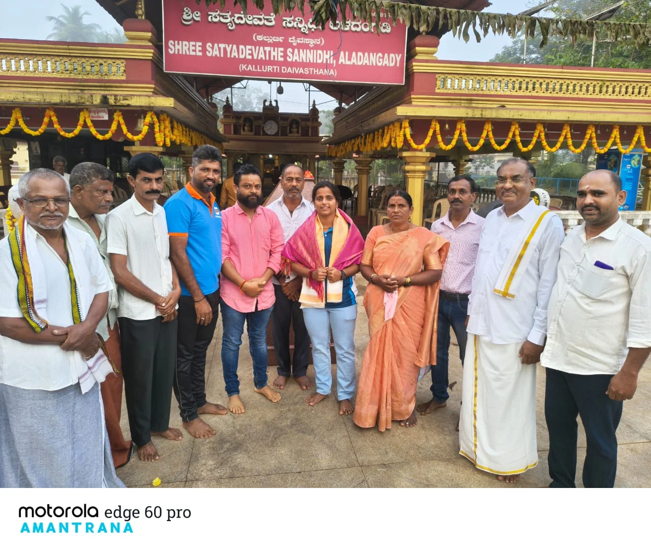 ಅಳದಂಗಡಿ ಶ್ರೀ ಸತ್ಯದೇವತಾ ದೈವಸ್ಥಾನಕ್ಕೆ ಭಾರತೀಯ ಕಬಡ್ಡಿ ತಂಡದ ಕು.ಧನಲಕ್ಷ್ಮೀ ಪೂಜಾರಿ ಇಂದು ಭೇಟಿ ನೀಡಿ ಆಶೀರ್ವಾದ ಪಡೆದರು. ಈ ಸಂದರ್ಭದಲ್ಲಿ ಆಡಳ್ತೇದಾರರಾದ ಶಿವಪ್ರಸಾದ್ ಅಜಿಲರು ಉಪಸ್ಥಿತರಿದ್ದು ಈಕೆಯನ್ನು ಗೌರವಿಸಿದರು. ಆಮಂತ್ರಣ ಪರಿವಾರದ ವಿಜಯ ಕುಮಾರ್ ಜೈನ್, ವಿಶ್ವನಾಥ ಬಂಗೇರ, ಧರ್ಣಪ್ಪ ಪೂಜಾರಿ ದೋರಿಂಜ, ಸುಂದರ ಪೂಜಾರಿ ನೀರಲ್ಕೆ, ಆನಂದ ಪೂಜಾರಿ ನೀರಲ್ಕೆ ಭಾಗವಹಿಸಿದ್ದರು.