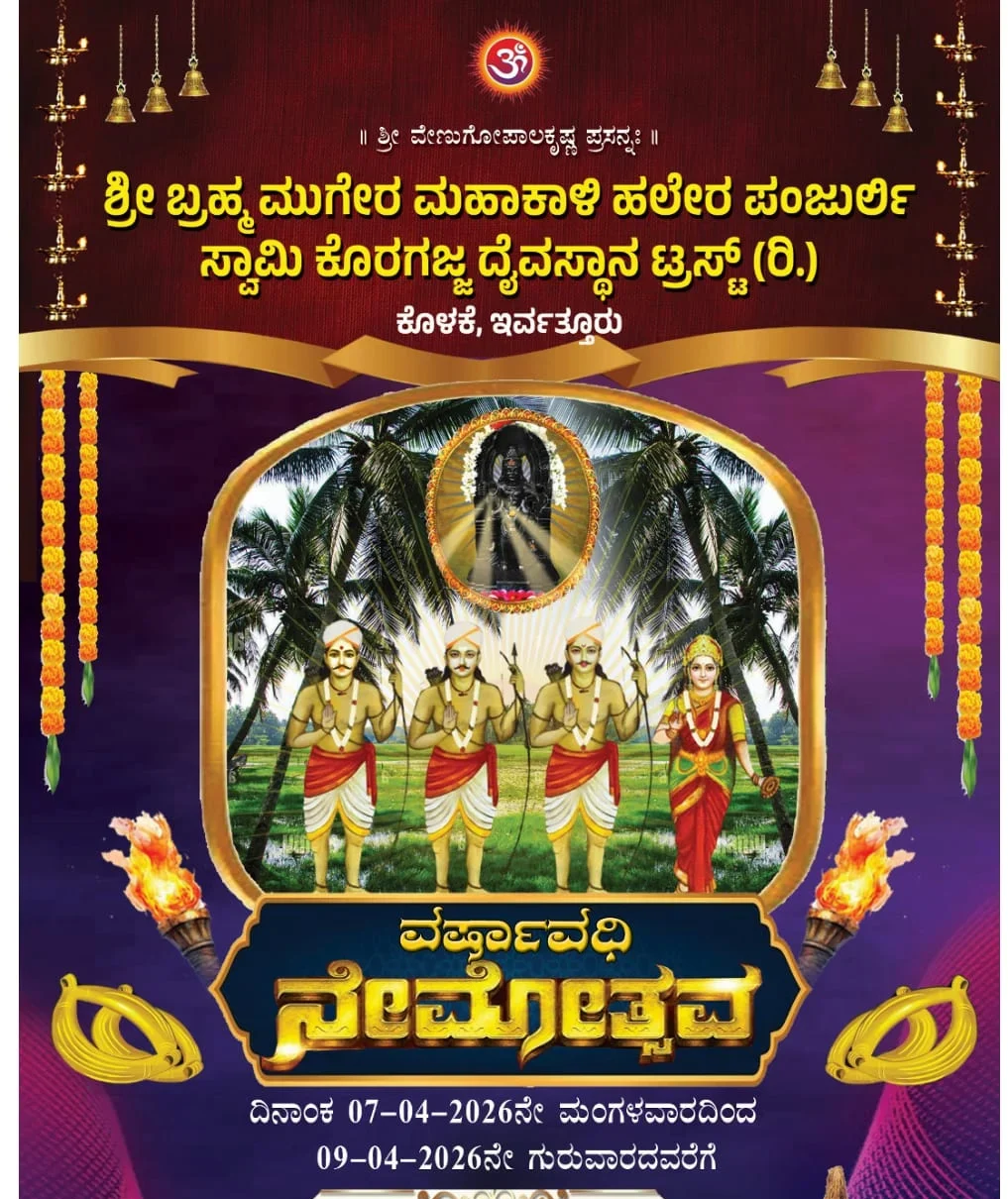 ಕಾರ್ಕಳ : ಶ್ರೀ ಬ್ರಹ್ಮ ಮುಗೇರ ಮಹಾಕಾಳಿ ಹಲೇರ ಪಂಜುರ್ಲಿ ಸ್ವಾಮಿ ಕೊರಗಜ್ಜ ದೈವಸ್ಥಾನ ಟ್ರಸ್ಟ್ (ರಿ.) ಕೊಳಕೆ,ಇರ್ವತ್ತೂರು ಏ.07-09ರವರೆಗೆ ವರ್ಷಾವಧಿ ನೇಮೋತ್ಸವ ನಡೆಯಲಿದೆ.